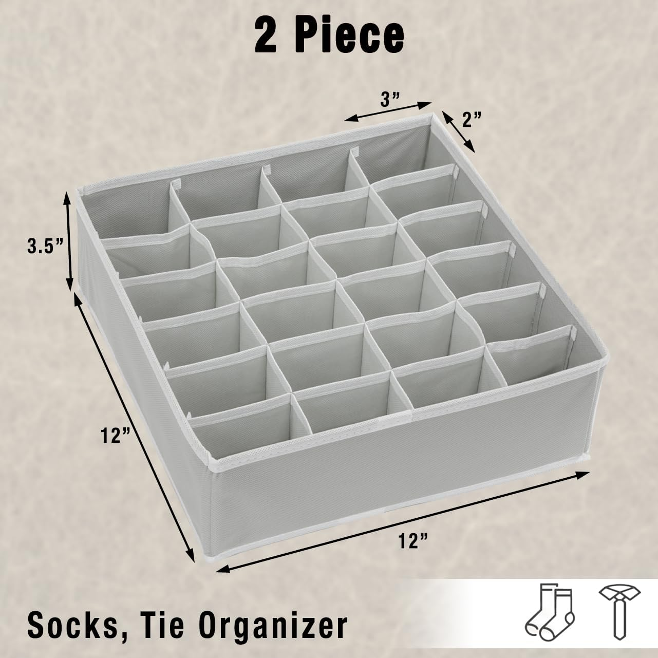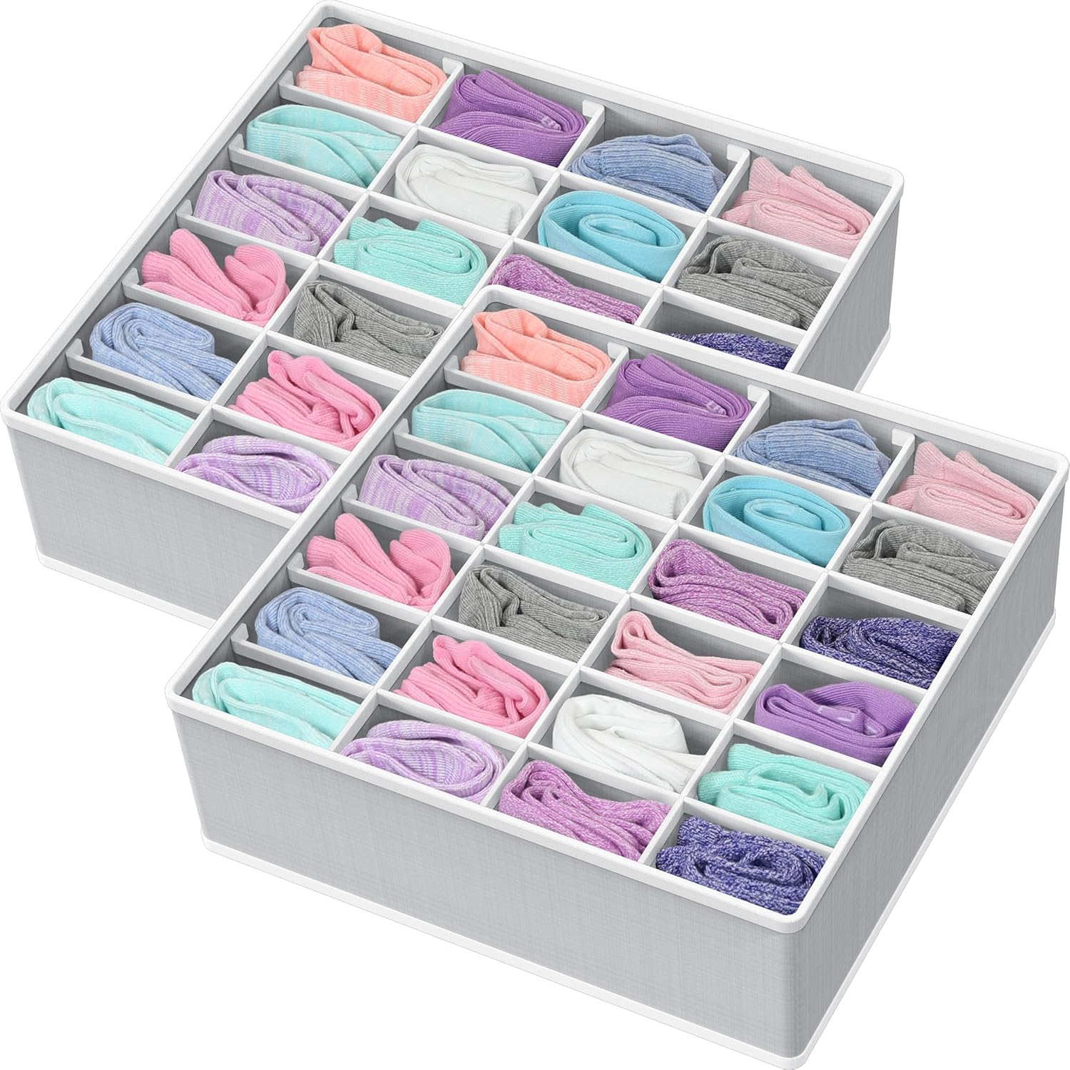 2 Pack Closet Sock Organizer, 24 Cell Drawer Divider, Gray