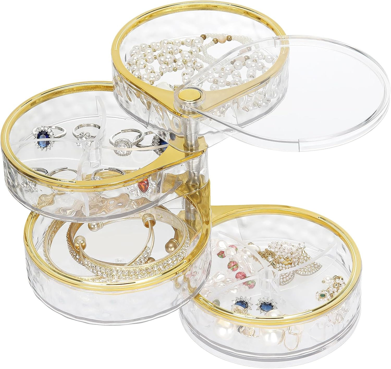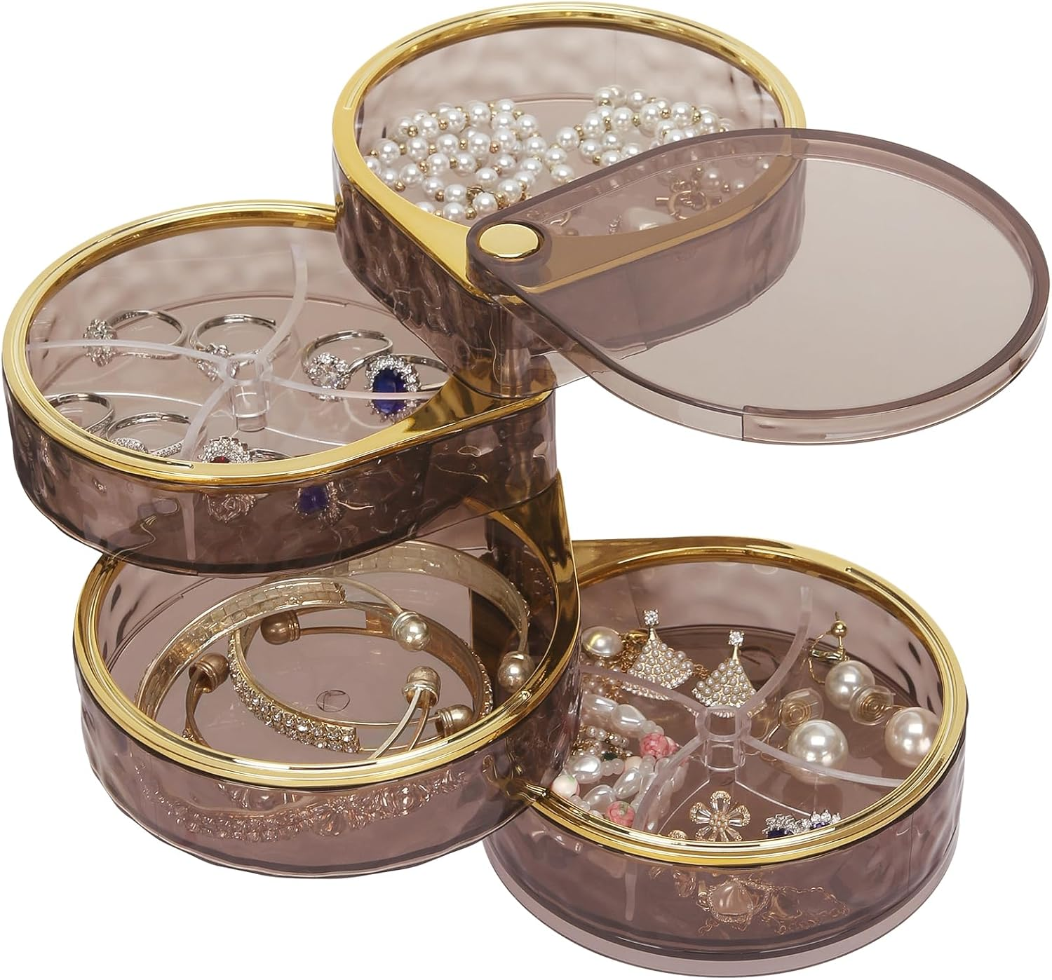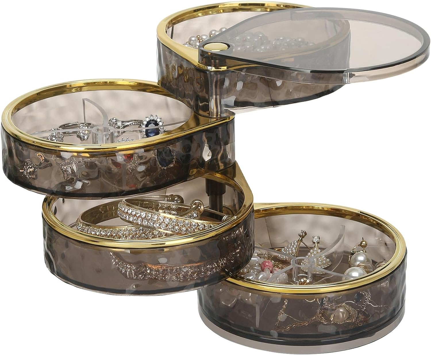 - 360° Rotating Design & Layered Storage: Smoothly rotate tiers to access items instantly. The ripple-textured surface adds elegance, while the 2nd and 4th layers feature four compartments each for secure storage of earrings, rings, or pins. Other tiers accommodate bracelets and bulkier accessories