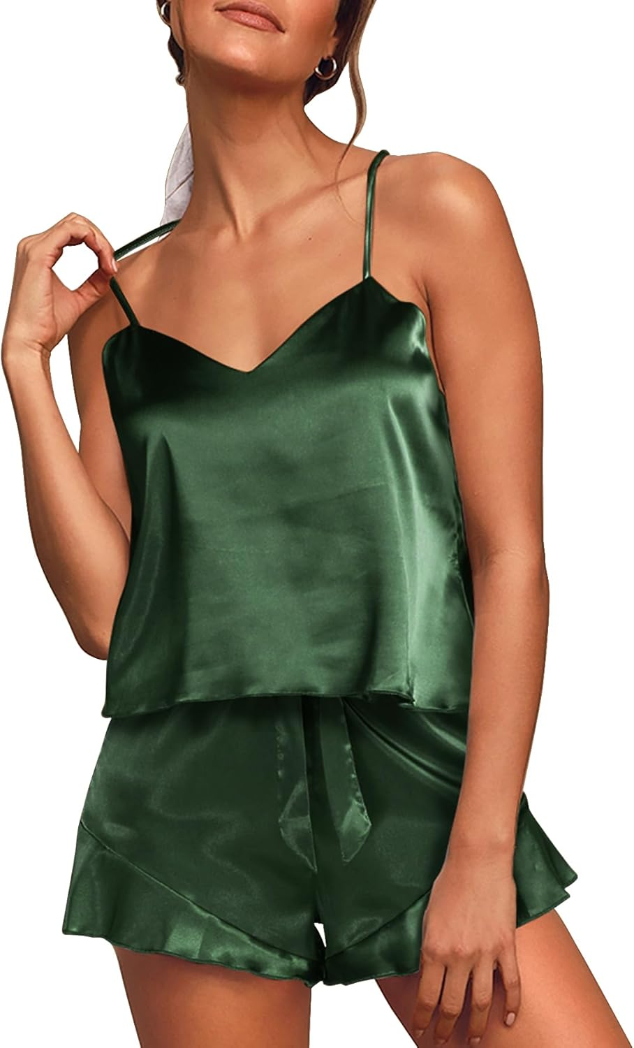 Aamikast Womens Silk Satin Pajama Sets Sexy Cami Ruffled Shorts Sets 2 Piece Pjs Sleepwear