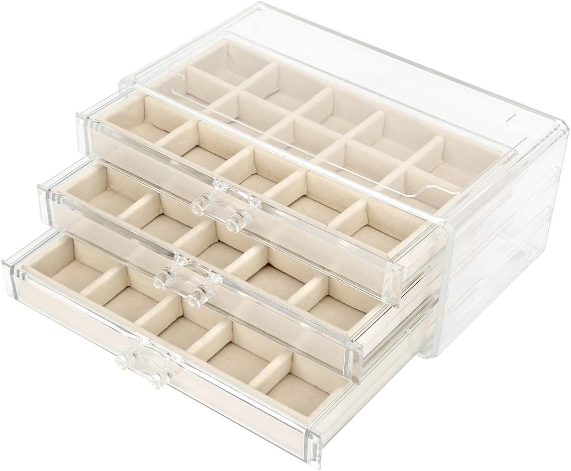 - Velvet jewelry box with 3 layer drawers,every drawer with 15 grids Acrylic Jewelry Box slide out smoothly, very easy to grab and pull out. the compartments keep your jewelry away from mess-up; easy to save your time to find what you need at the first glance