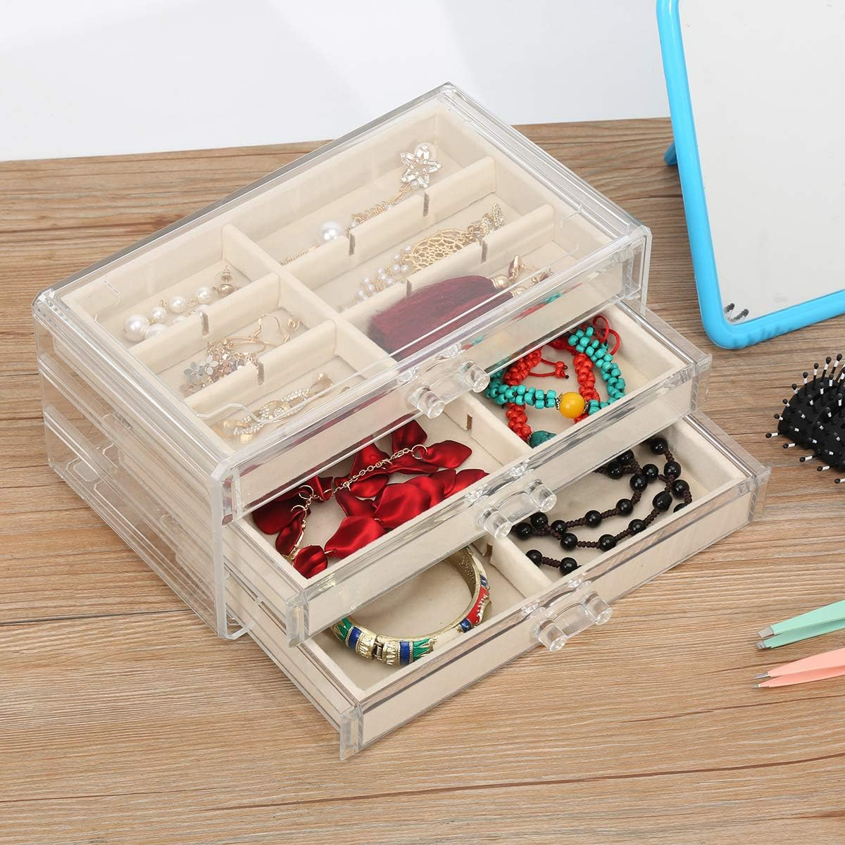 Acrylic Jewelry Organizer Makeup Cosmetic Storage Organizer Box Clear Jewelry Case with 3 Drawers Adjustable Jewelry Box Velvet Trays Grid Size