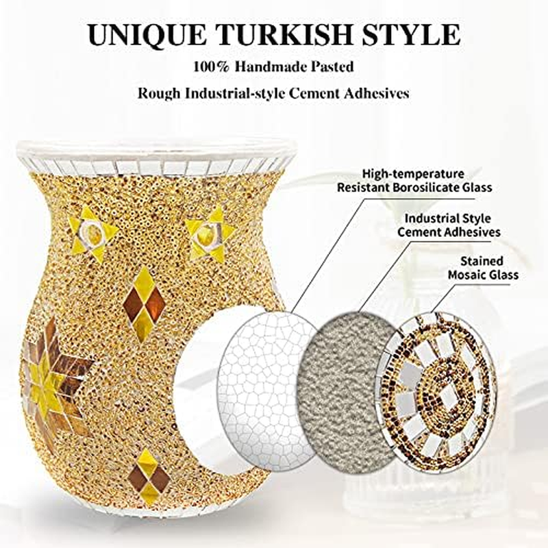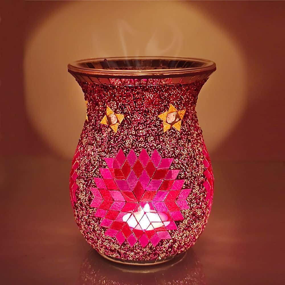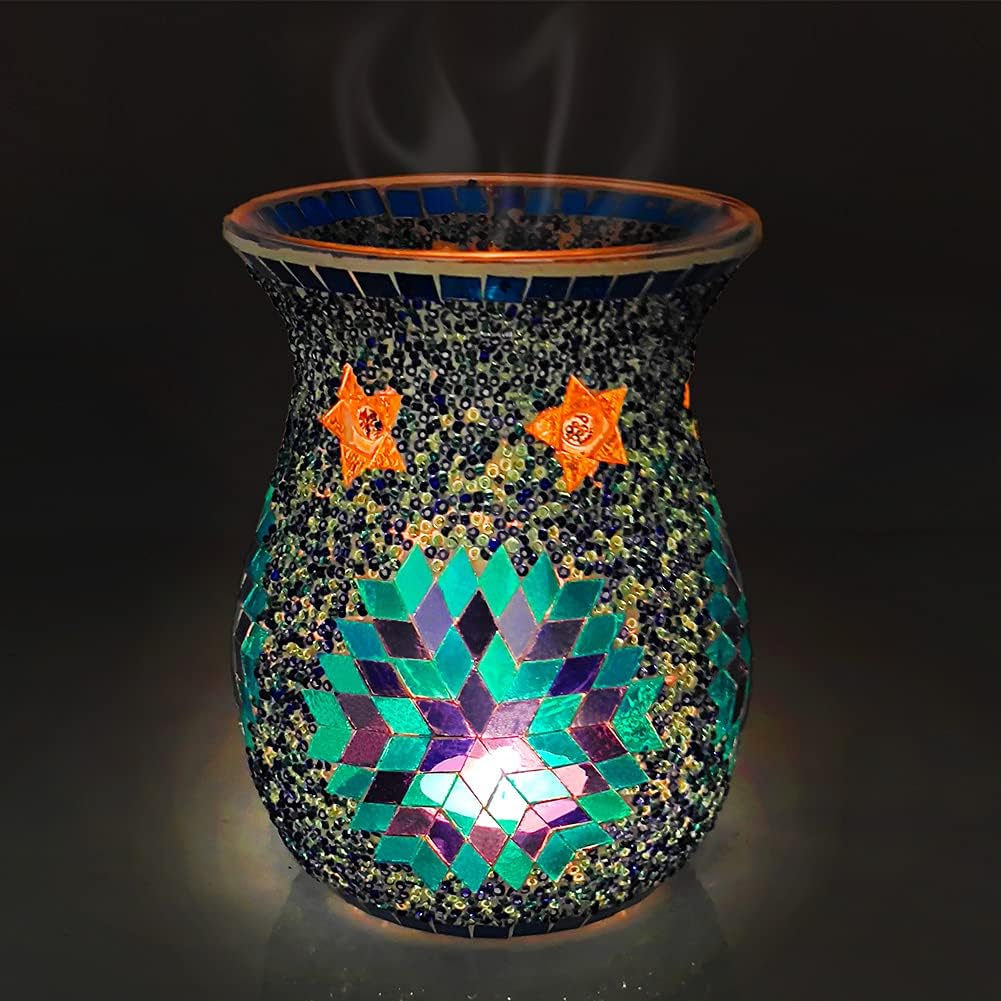 - EXQUISITE HANDMADE CRAFTSMANSHIP: The stained mosaic glass oil burner is 100% handmade and pasted using industrial-style cement adhesives, which is why the burners look rough after you received them, don’t worry, this is our unique Turkish style, lightweight design which can emit fragrance and allows soft light to go through. Perfect for home decoration