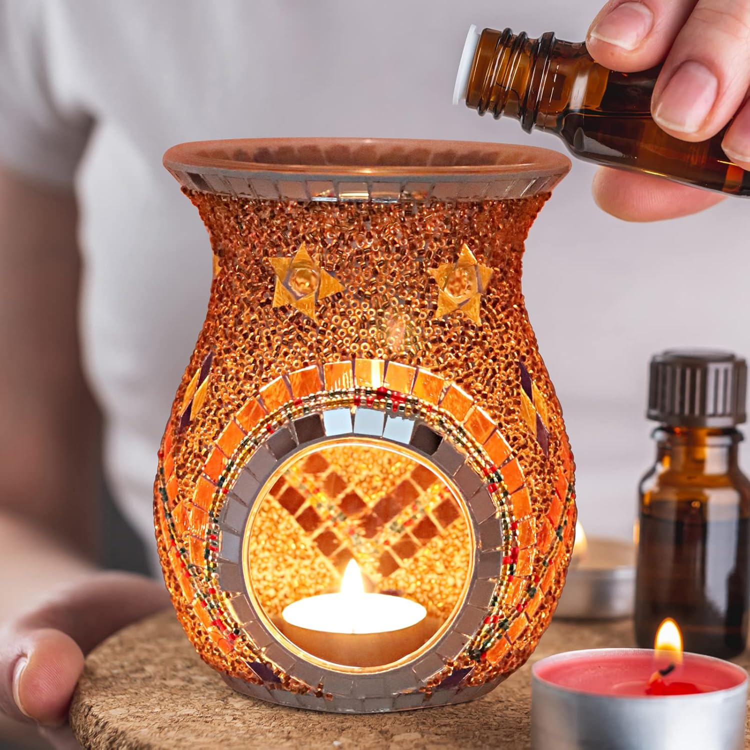 Essential Oil Burner, Incense Aromatherapy Oil Diffuser, Fragrance Warmer, Mosaic Glass Tealight Candle Holder Burners for Home Room Decor, Orange, 5.5" H