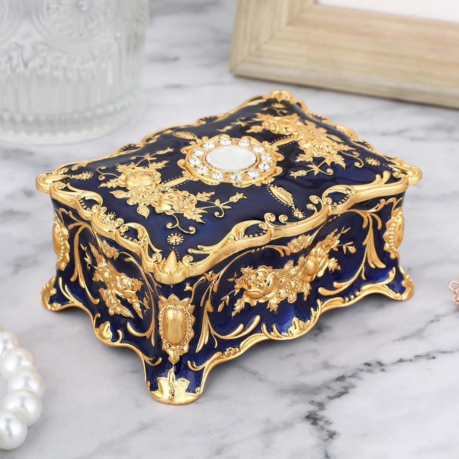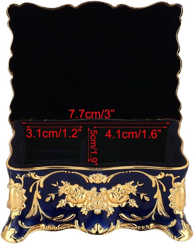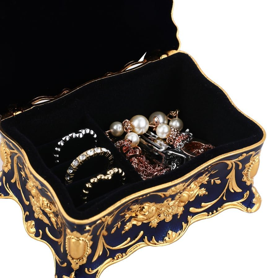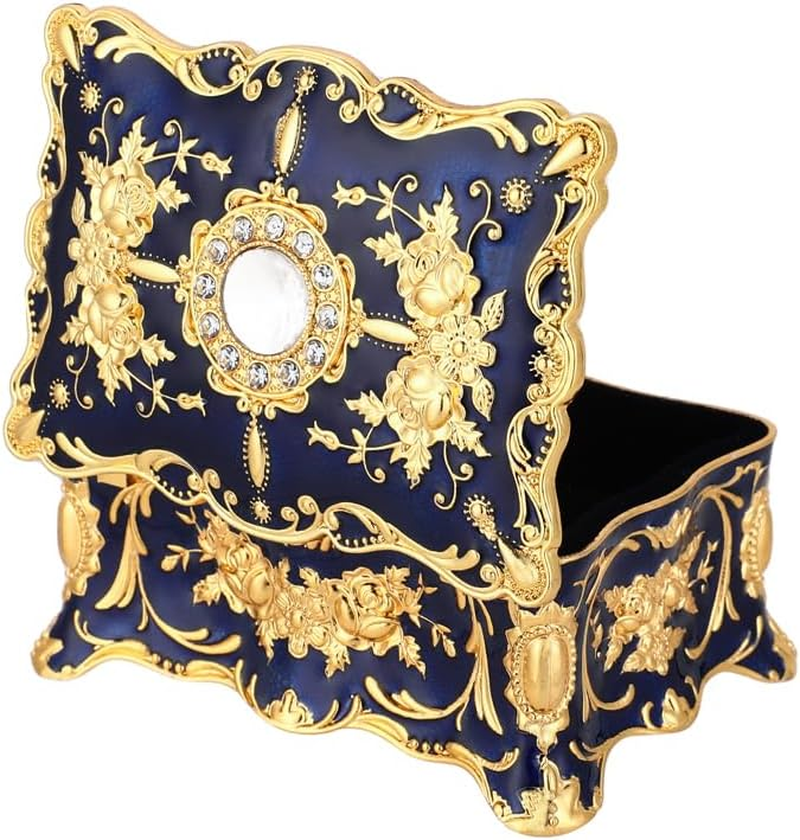 - High quality metal - This vintage jewelry box is made of high-quality zinc alloy, which is durable, resistant to oxidation, rust, and does not fade. Soft and elegant deep blue velvet inside, protecting jewelry from dust and scratches