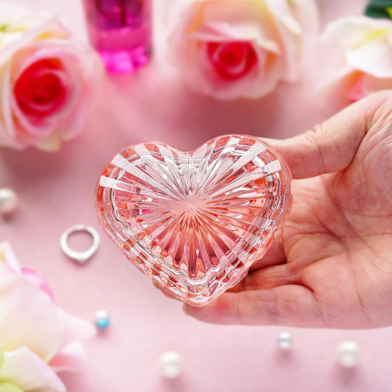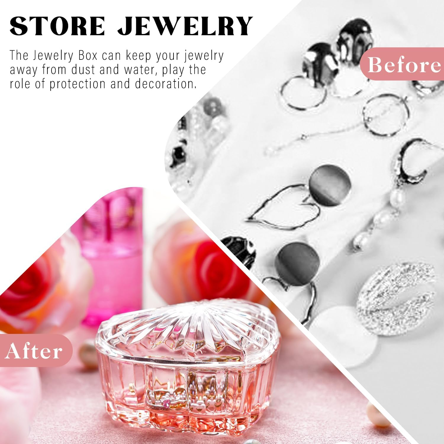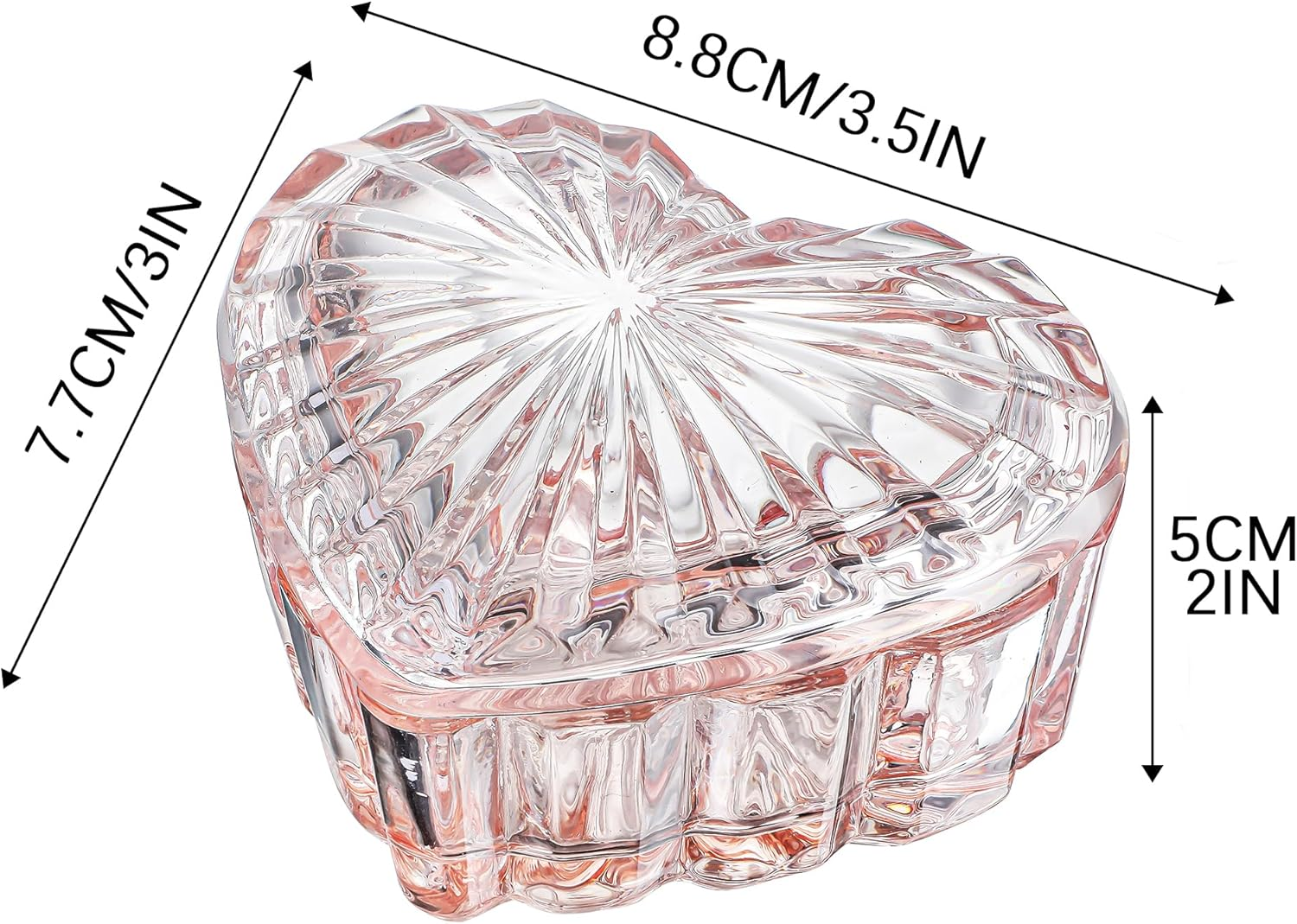 - Double-duty Glass Heart Shape Box: Use this glass jar with lid to store earrings, rings, bracelets, hair accessories, trinkets, flowers, and more on your vanity, bathroom, and bedroom. It can keep your jewelry away from dust and water, play the role of protection and decoration. It can also be used to store small candies, small snacks to enjoy a cozy holiday