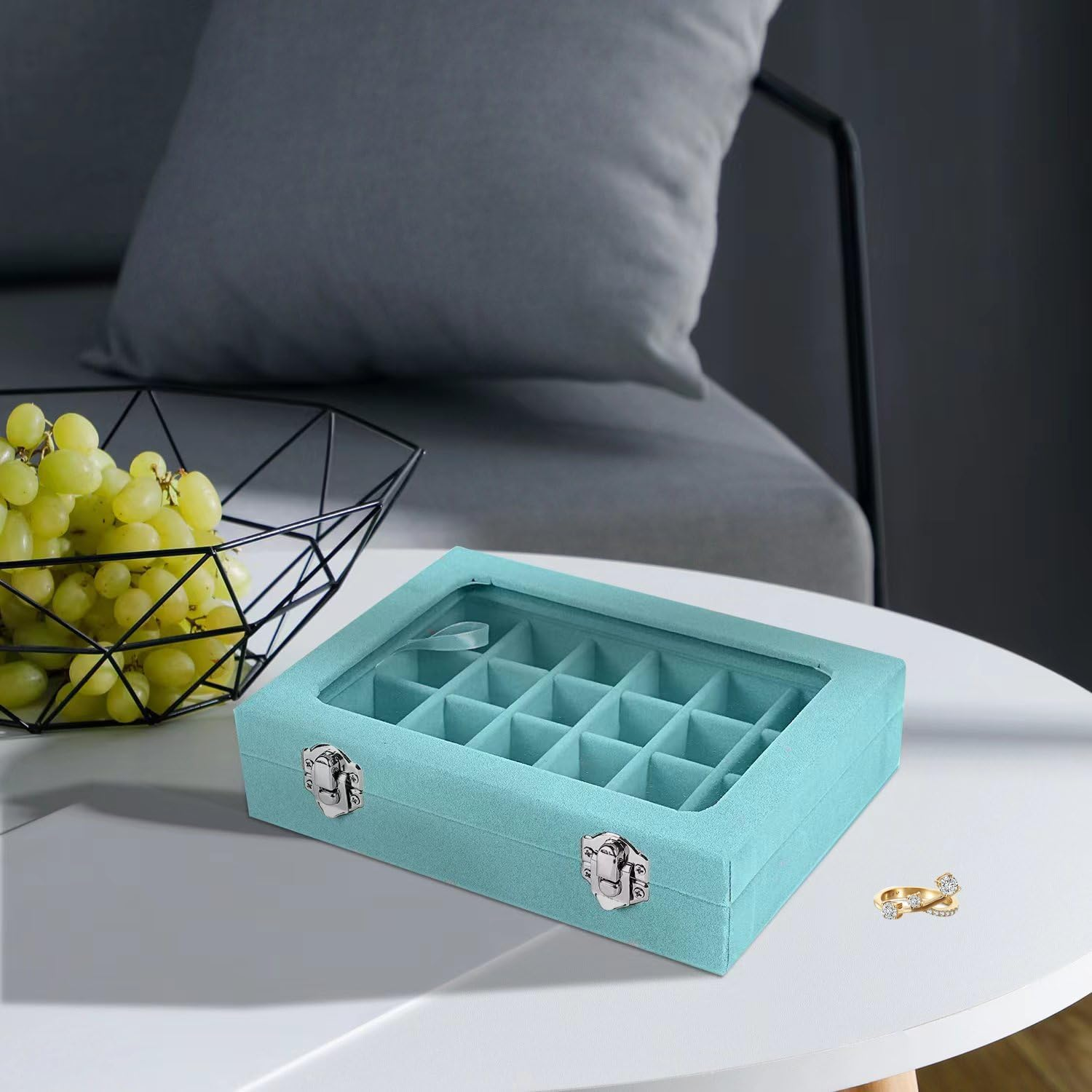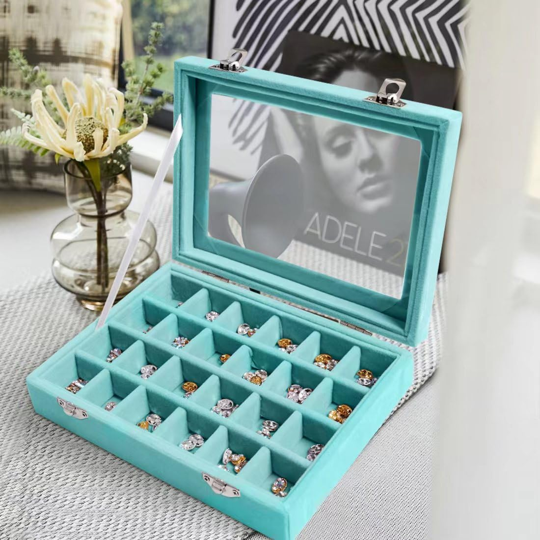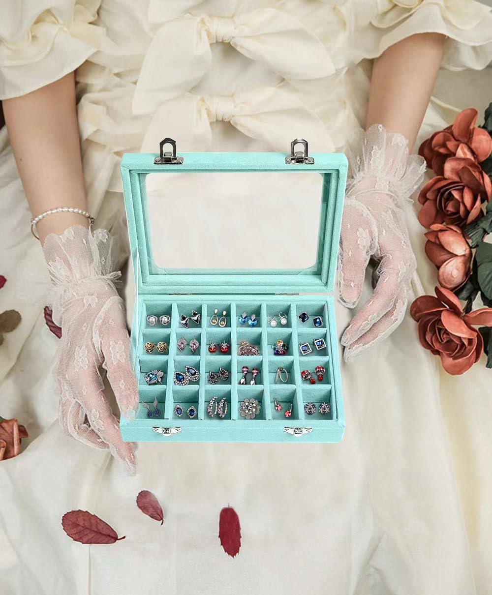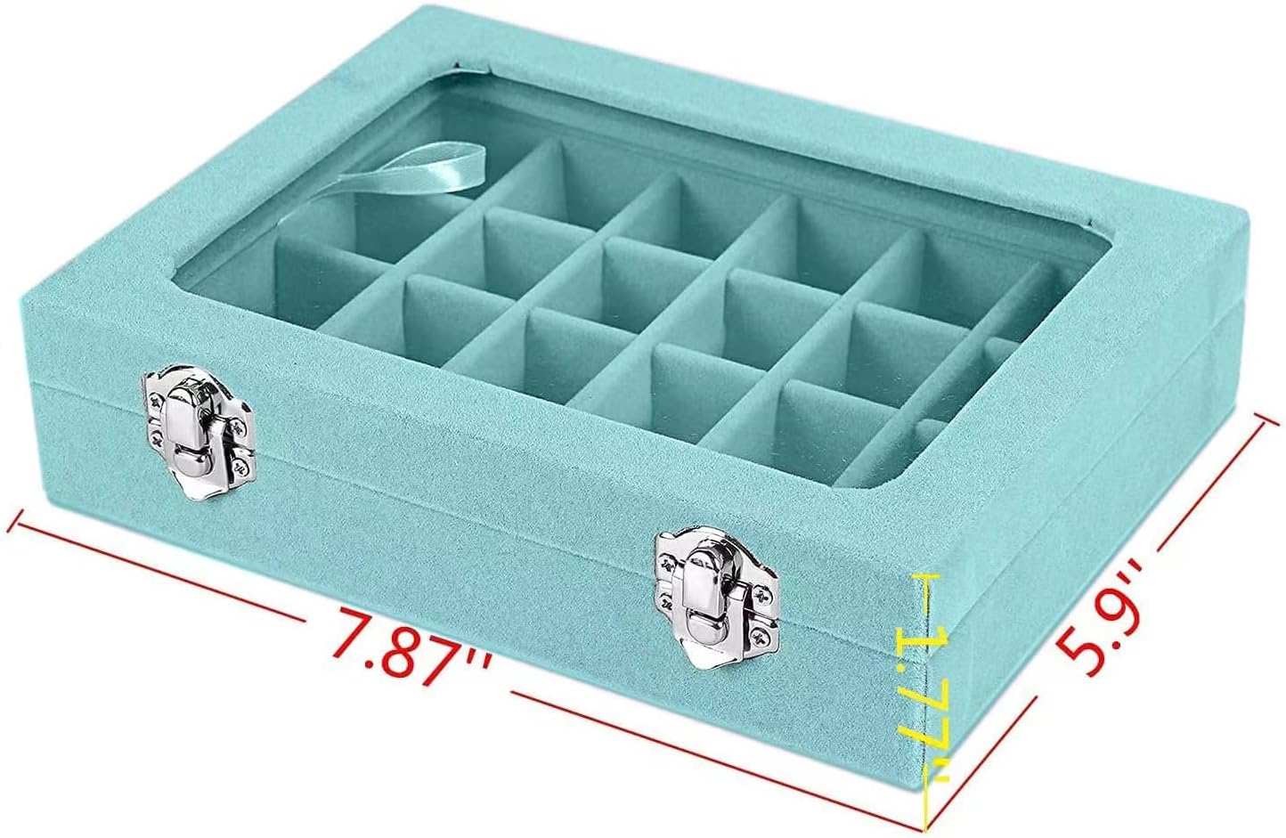 Jewelry Box 24 Grid Velvet Earrings Holder Tray Detachable Earring Case Jewelry Showcase for Drawers Glass Clear Lid Organizer Jewelry Display Storage Ring Trays (Light Blue)