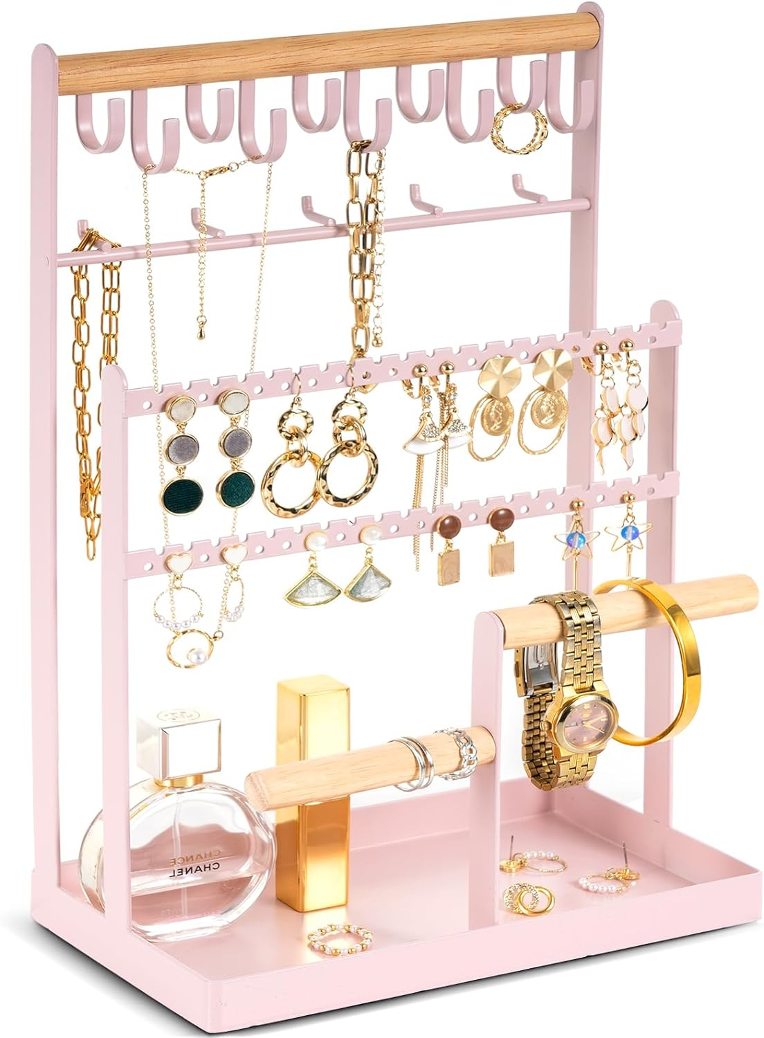 - Sturdy and Stable - The metal structure with padded bottom for sure helps keep all your pieces safely hung and it doesn’t scratch surfaces. It will look really cute sitting on your dresser or bathroom counter