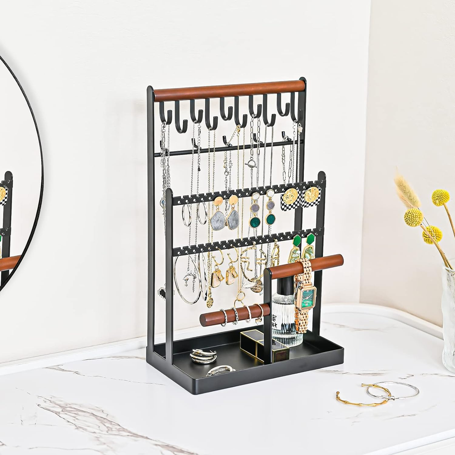 Jewelry Organizer Stand Necklace Organizer Earring Holder, 6 Tier Jewelry Stand Necklace Holder with 15 Hooks, Jewelry Tower Display Rack Storage Tree for Bracelets Earrings Rings -Black