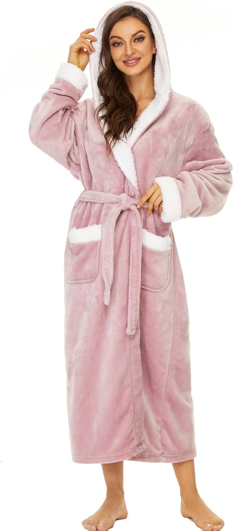 Women’s Long Plush Fleece Hooded Robe – Cozy Warm Lounge Bathrobe