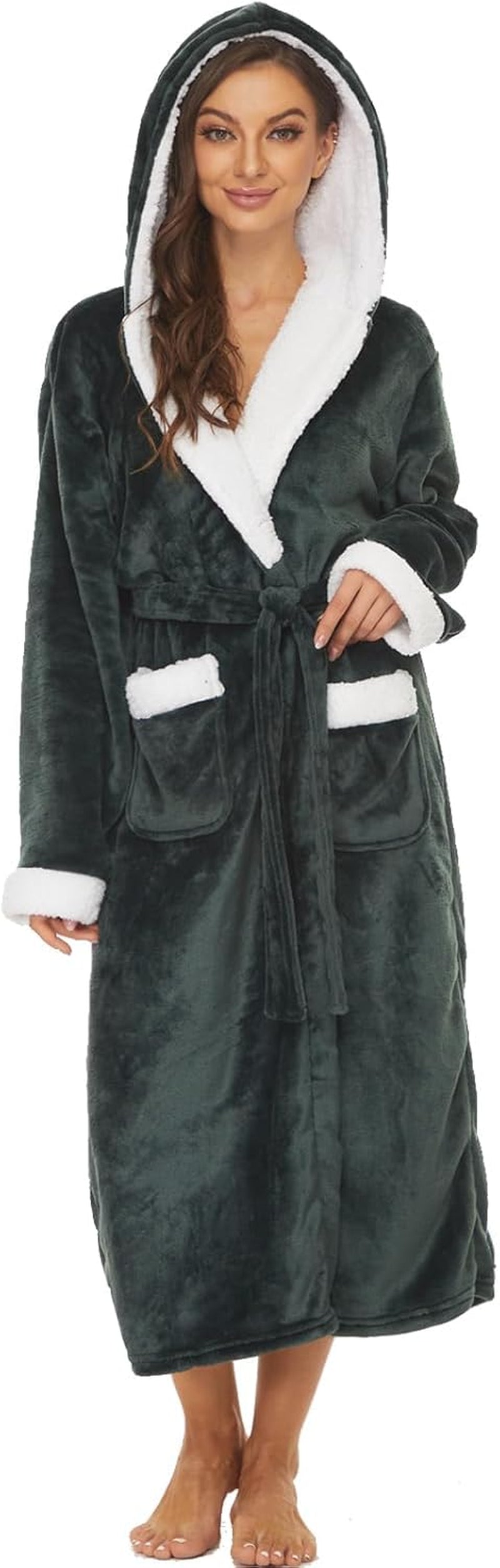 Women’s Long Plush Fleece Hooded Robe – Cozy Warm Lounge Bathrobe