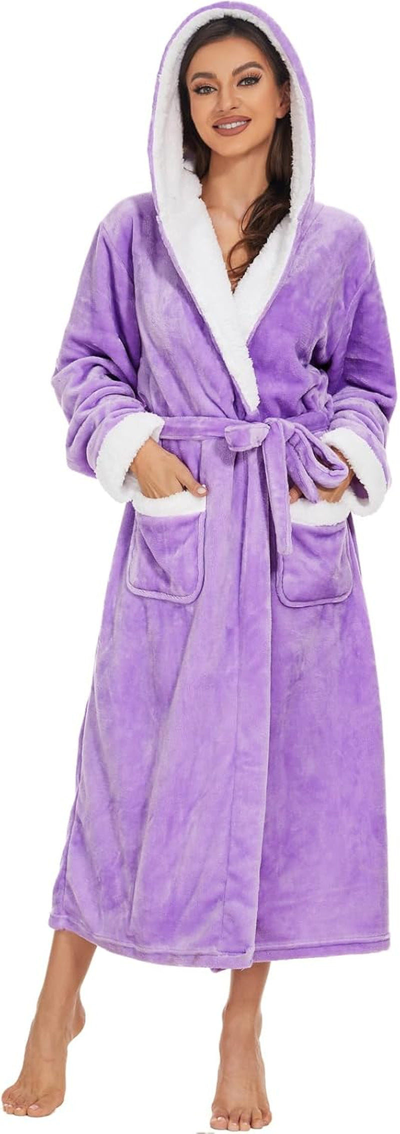 Women’s Long Plush Fleece Hooded Robe – Cozy Warm Lounge Bathrobe