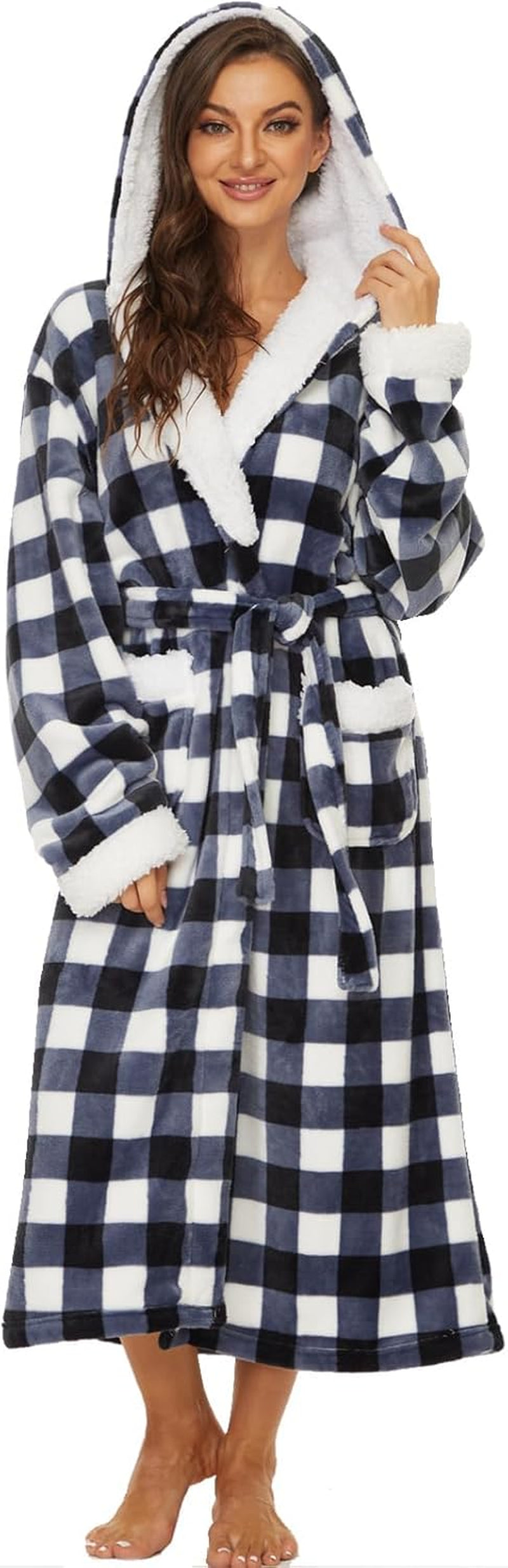 Women’s Long Plush Fleece Hooded Robe – Cozy Warm Lounge Bathrobe