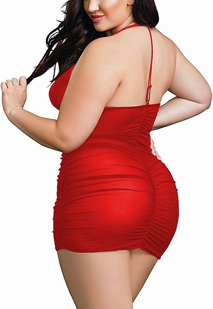 Plus Size Sheer Stretch Mesh Babydoll Dress Zipper Shirring Halter Chemise Curvy