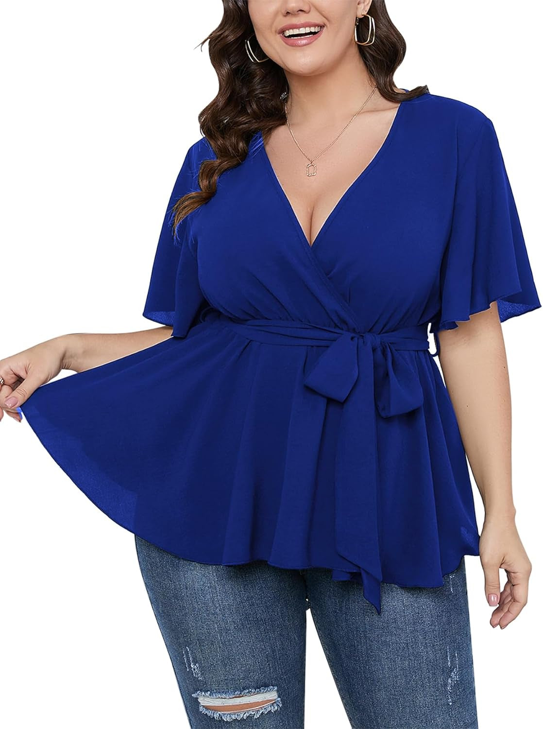 Women’s Plus Size Peplum V-Neck Short Sleeve Blouse with Belt – Elegant Dressy Top by SCOMCHIC