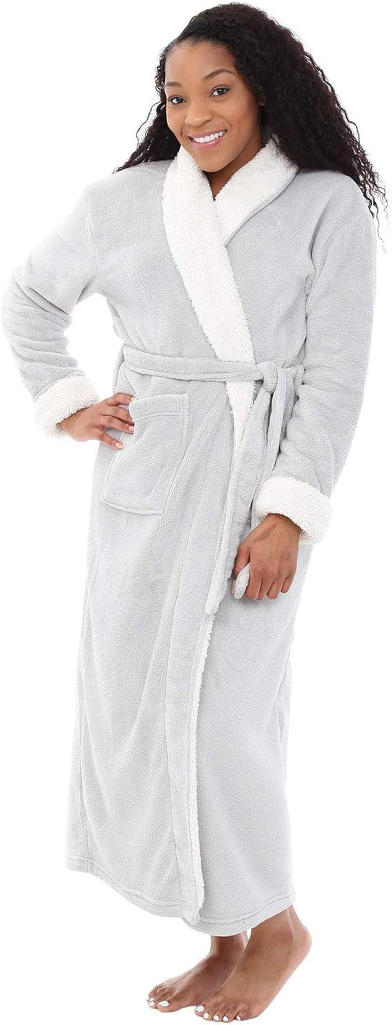 Women’s Plush Sherpa Long Bath Robe – Cozy Warm Lounge Housecoat with Pockets