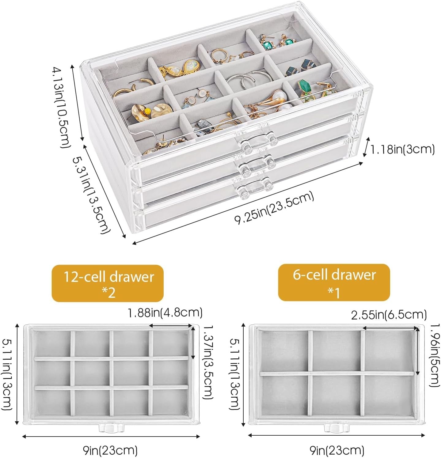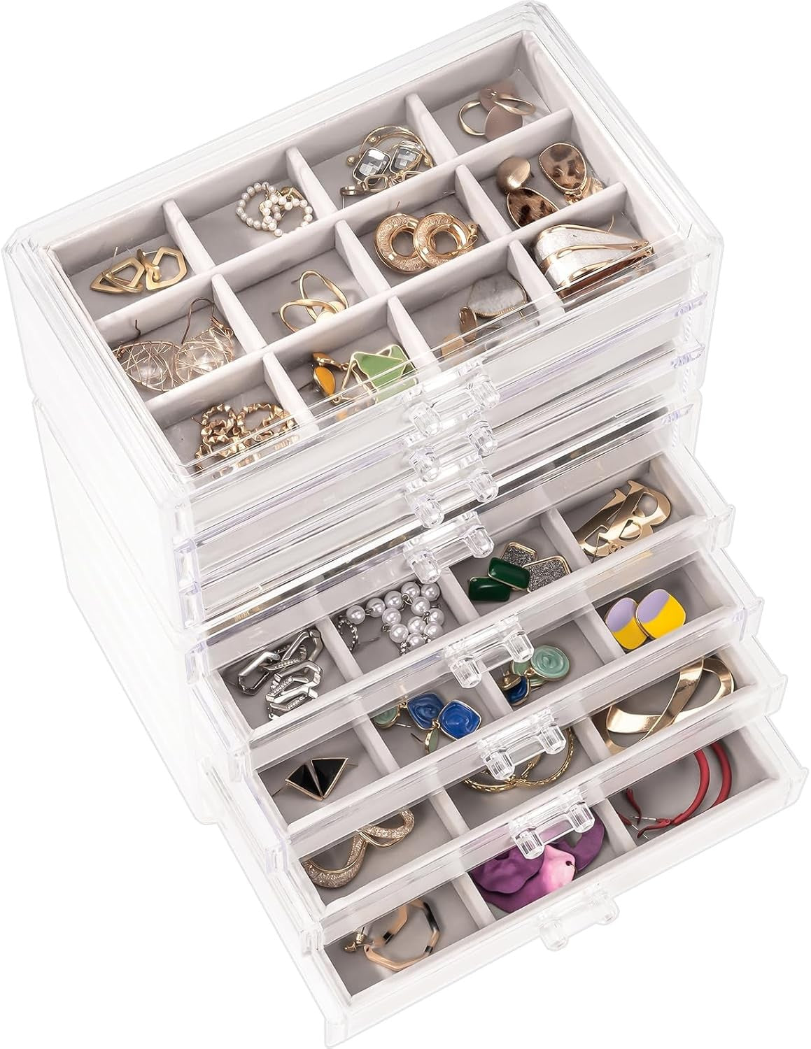 Procase Earring Holder Organizer Jewelry Box with 3 Drawers, Acrylic Clear Earring Case with Adjustable Velvet Trays for Women - Grey, 3 Layers