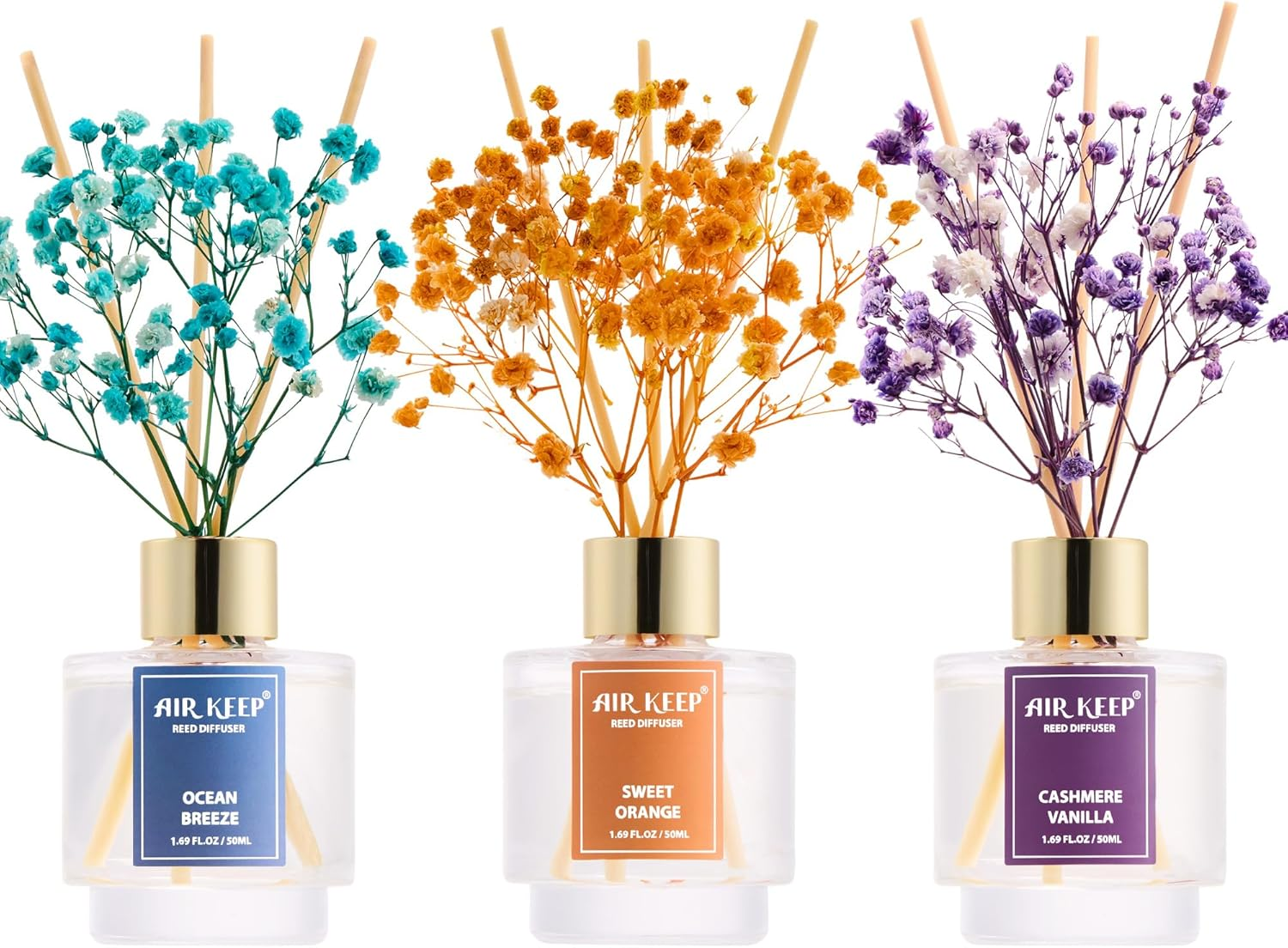 - Includes:3*fragrance diffuser glass bottle with 1.69 fl oz(50ml) essential oils fragrance, 3 sets of preserved flowers, 24* Reed diffuser sticks, 1* Exquisite gift box.