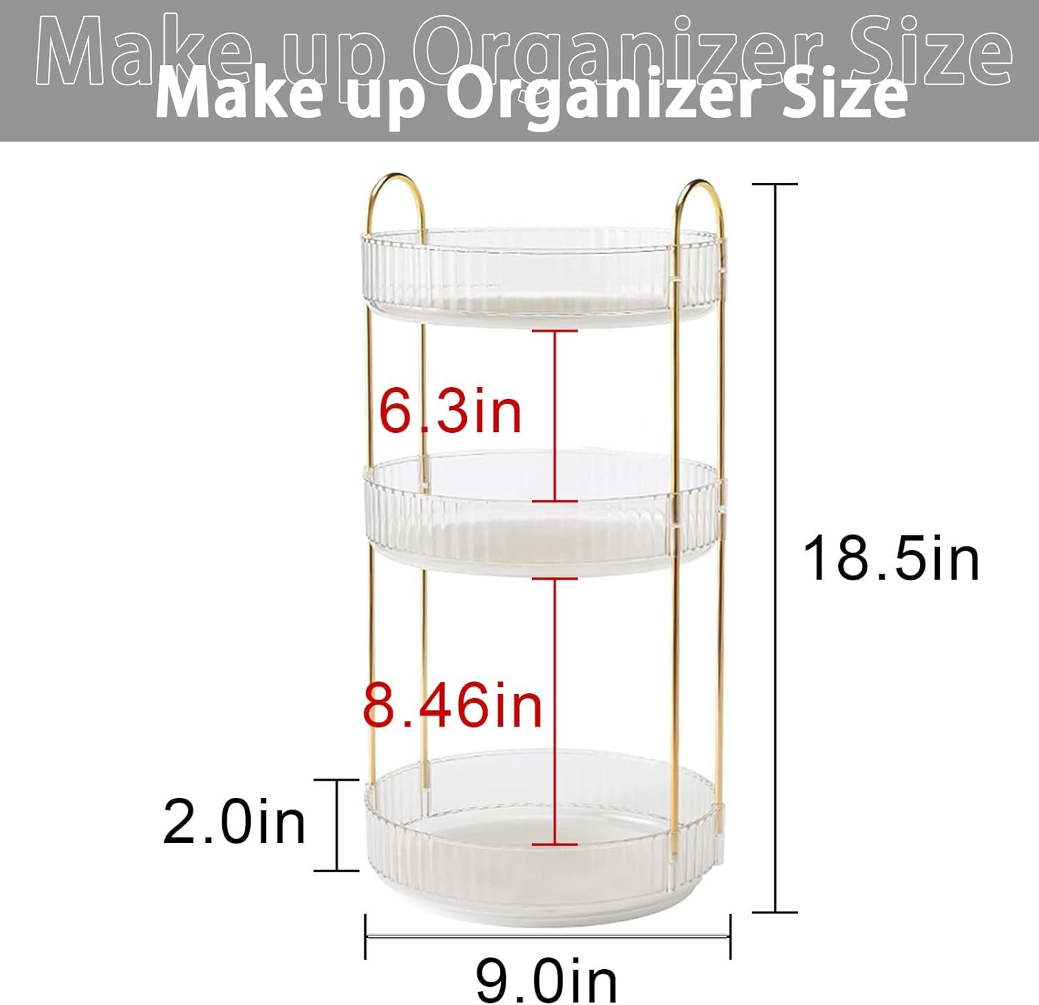- Large Capacity: This organizer 2 tier measures 9''D x 9''W x 12.5''H, 3 tier measures 9''D x 9''W x 18.5''H (please measure your countertop space before purchasing). Great for organizing skincare, makeup, perfume or anything you like, save space and increase storage capacity