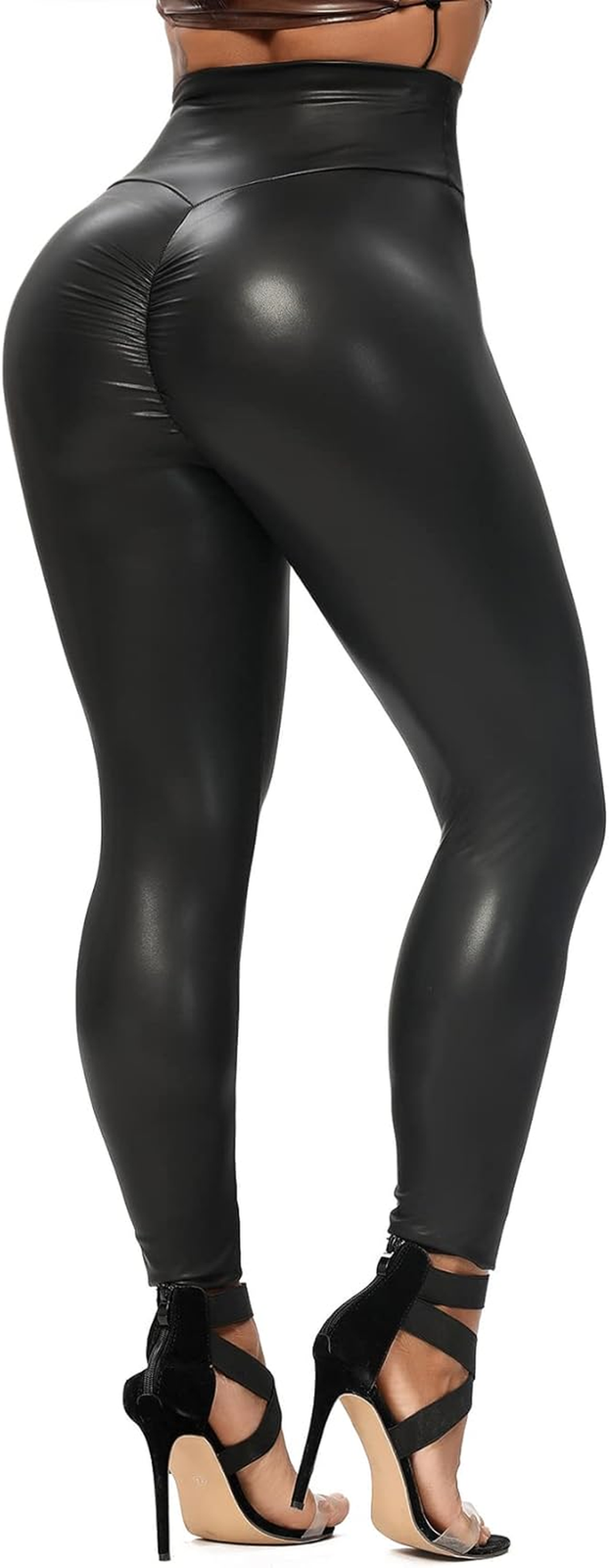 SEASUM Faux Leather Leggings for Women Stretchy High Waisted Butt Lifting Black Pleather Pants Outfit Sexy PU Leggings Tights