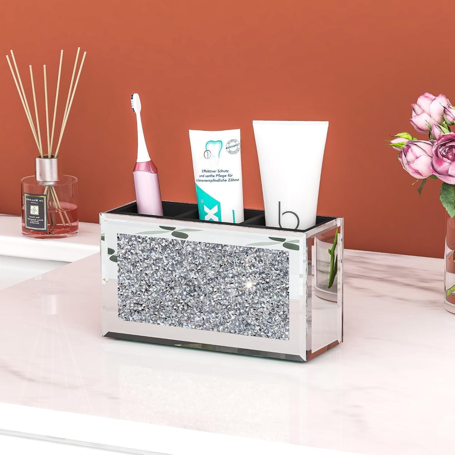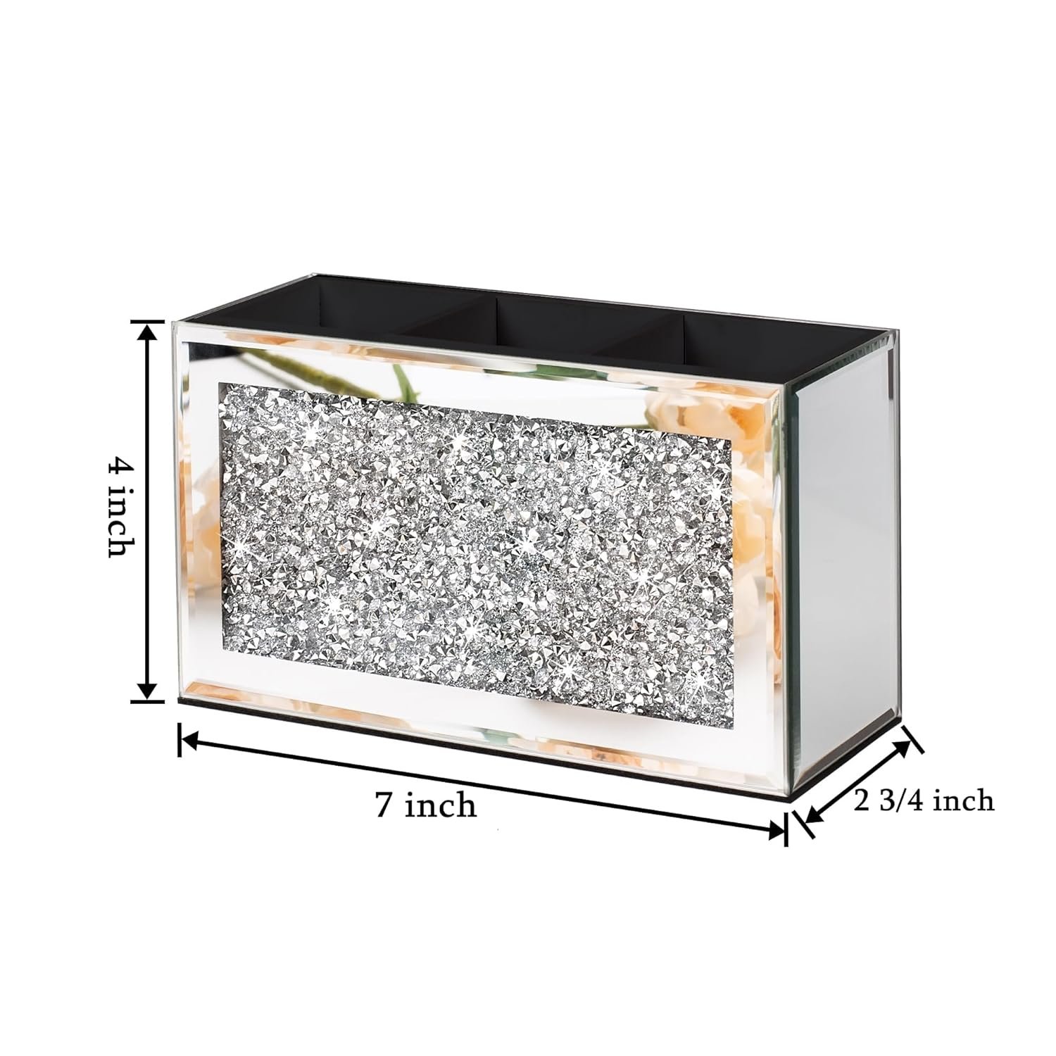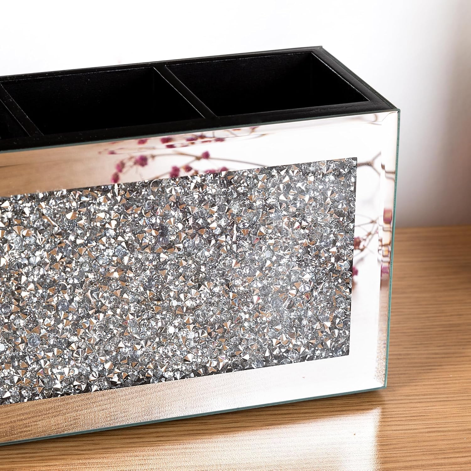 - đăMirrored make-up brushes organizerăThis Silver Mirror Glass Brush Holder features crushed diamond at the center, which is eye-catching and adds charm and style to your bedside table or dressing table.