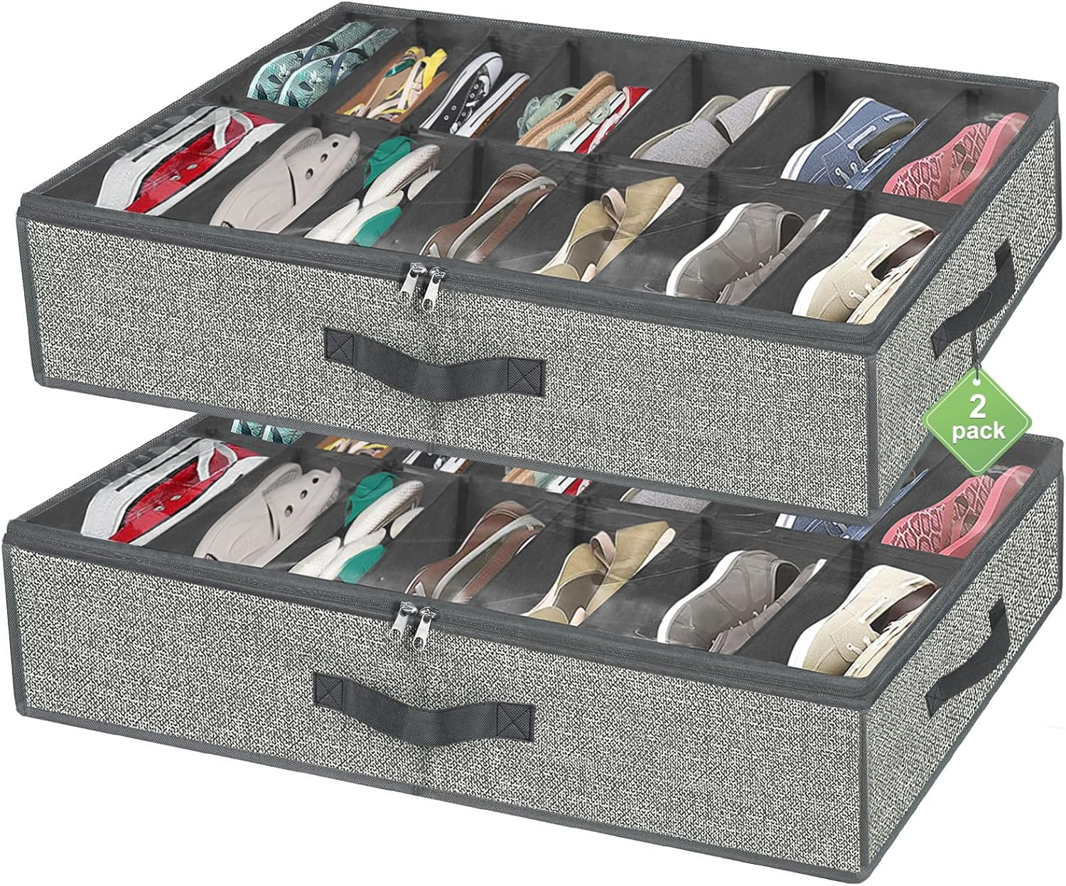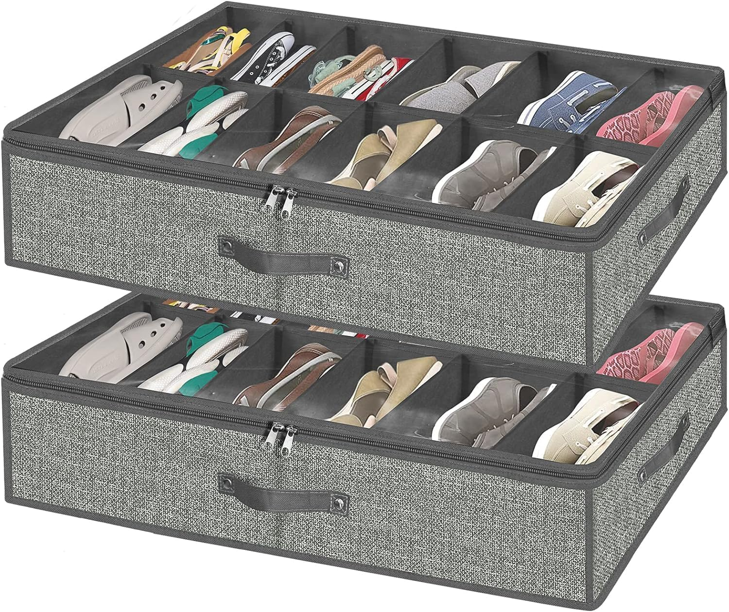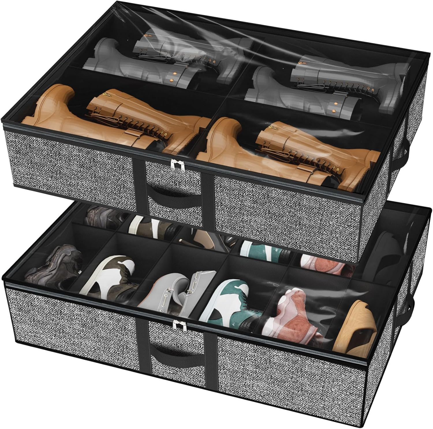 Under Bed Shoe Storage Organizer for Closet Fits 24 Pairs-Sturdy Underbed Shoe Storage Box Bins,Set of 2 (Linen-Like Black)