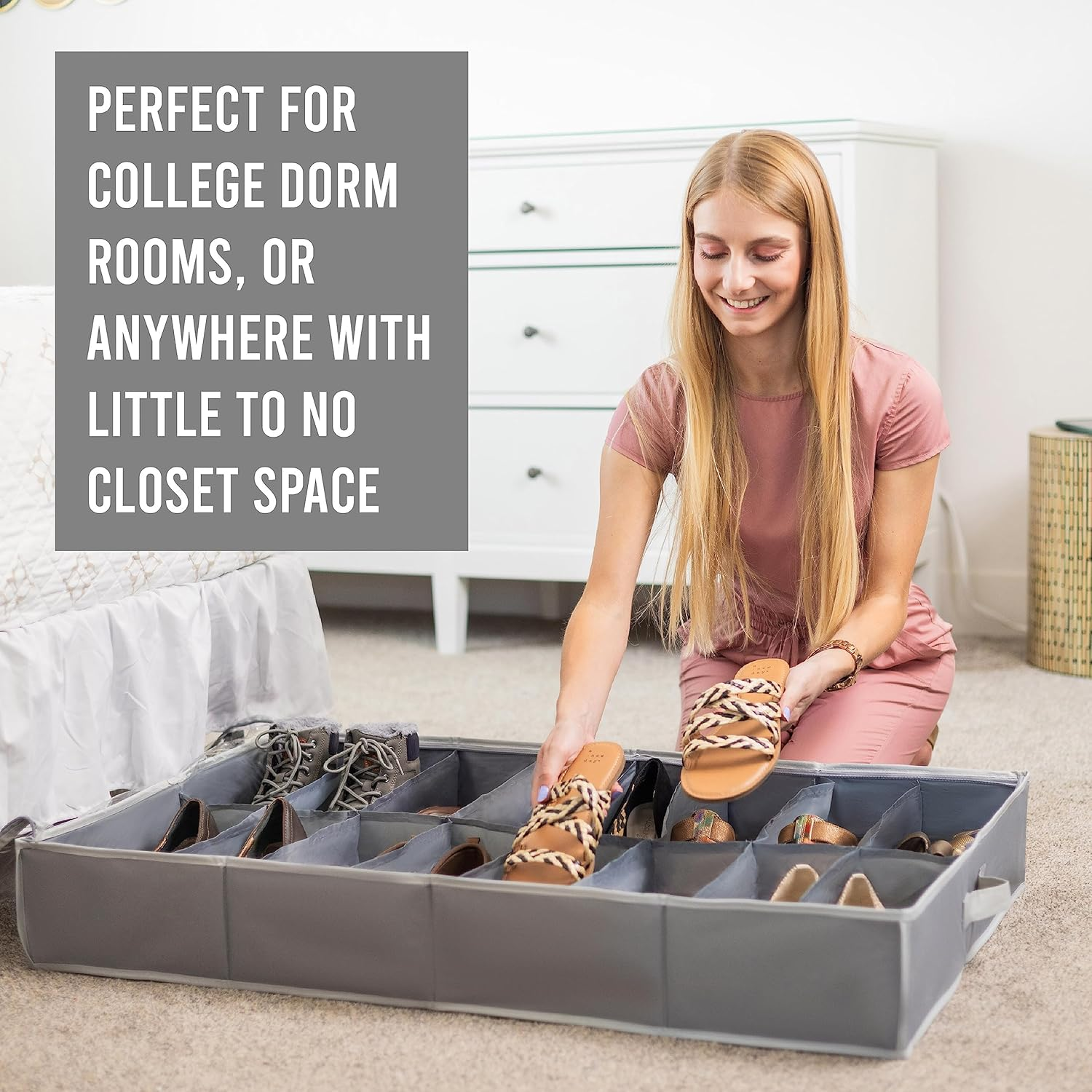 Under Bed Shoe Storage Organizer - TEAR-RESISTANT Heavy Duty 600D Material - Fits All Styles Men'S and Women'S Shoes, up to 16 Pairs - Extra-Strong Zipper - Grey - Perfect for College Dorms