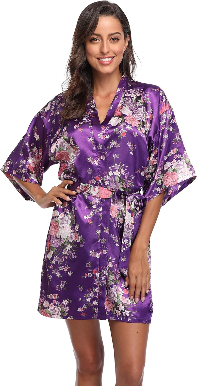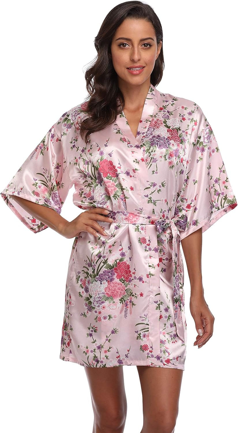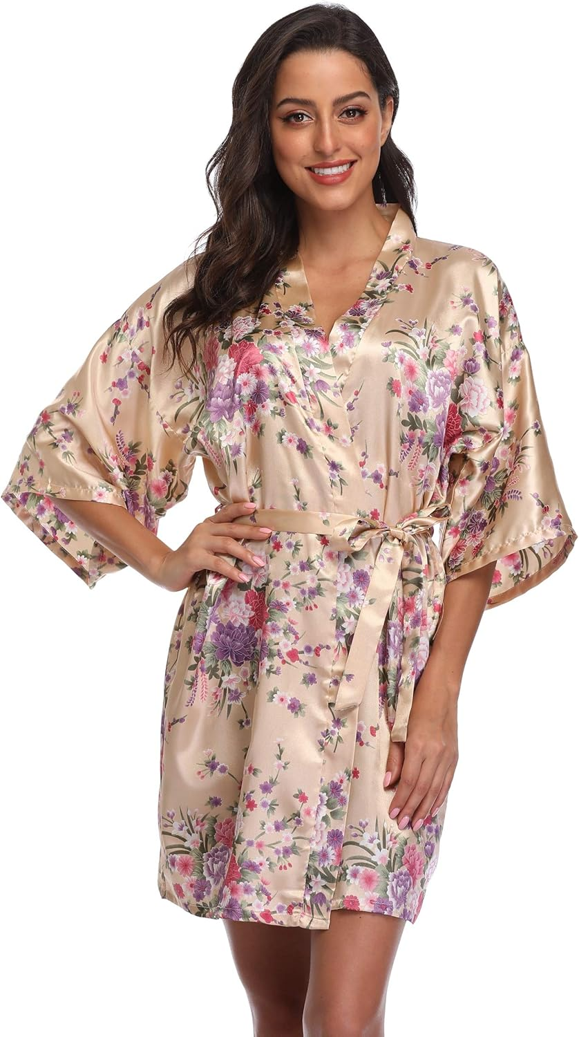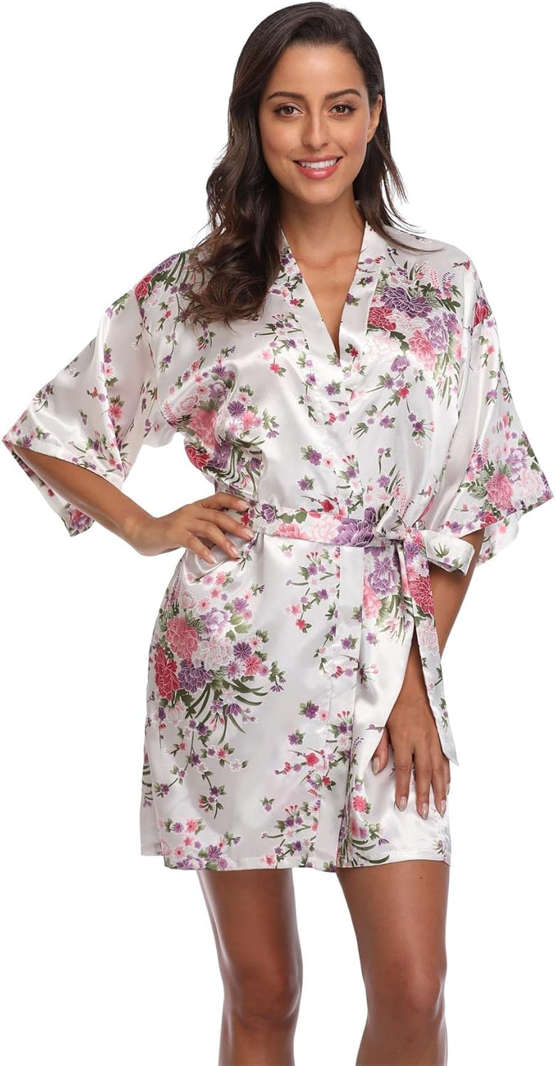 Women Floral Satin Kimono Robes Short Bridesmaid Robe for Getting Ready Wedding Dressing Gown