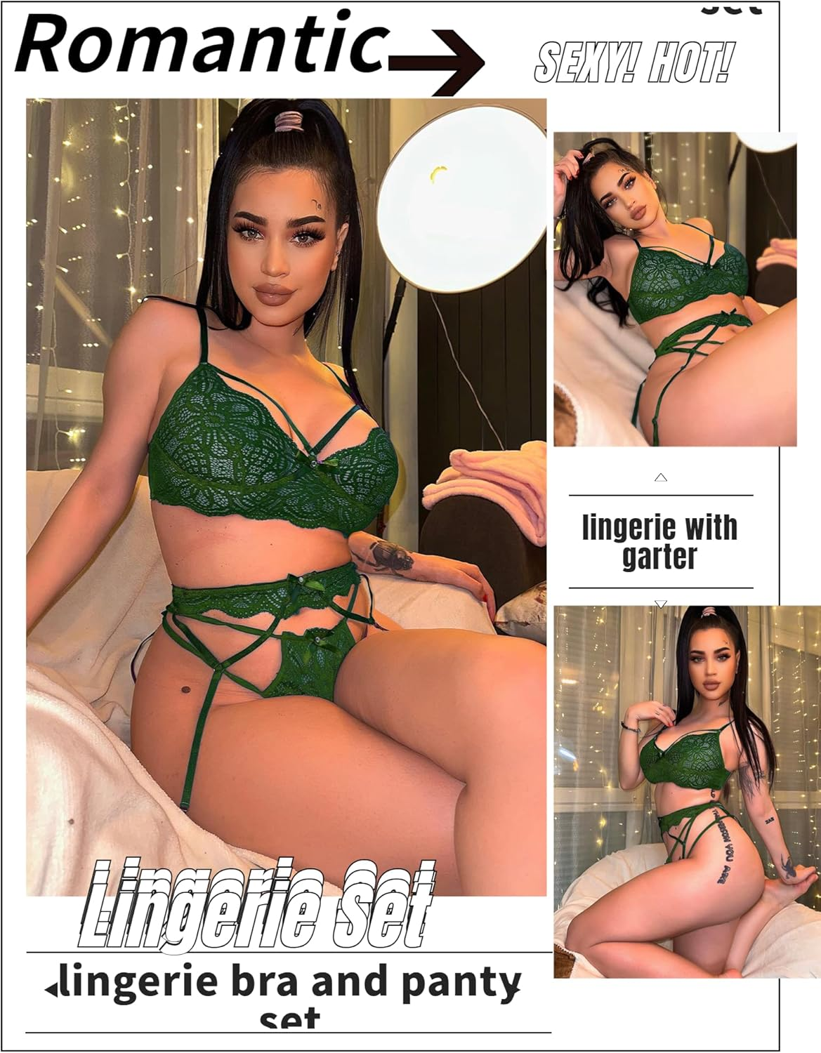 Women Lingerie Set with Garter Belts Sexy Bra and Panty Set Lace Teddy Bodysuit