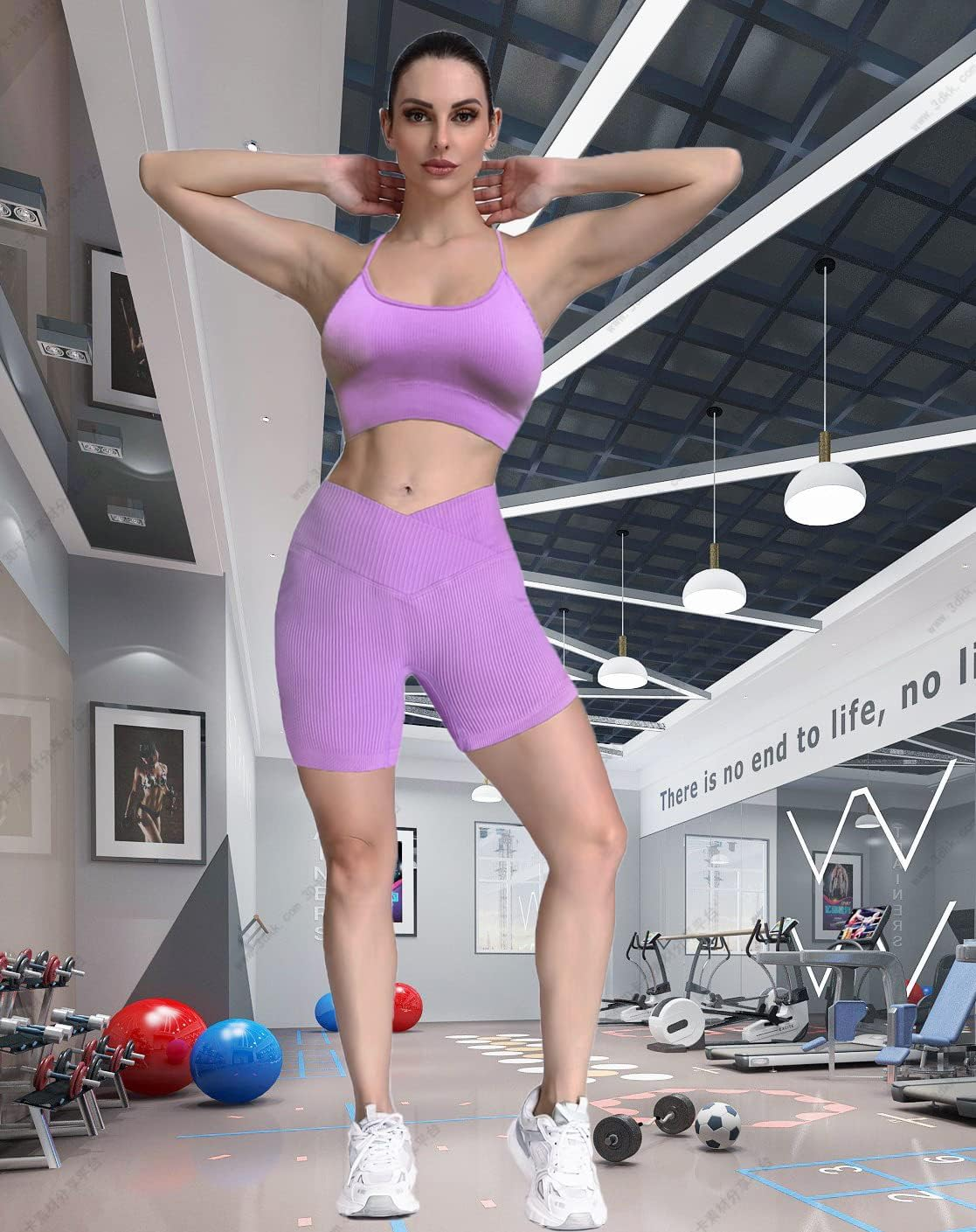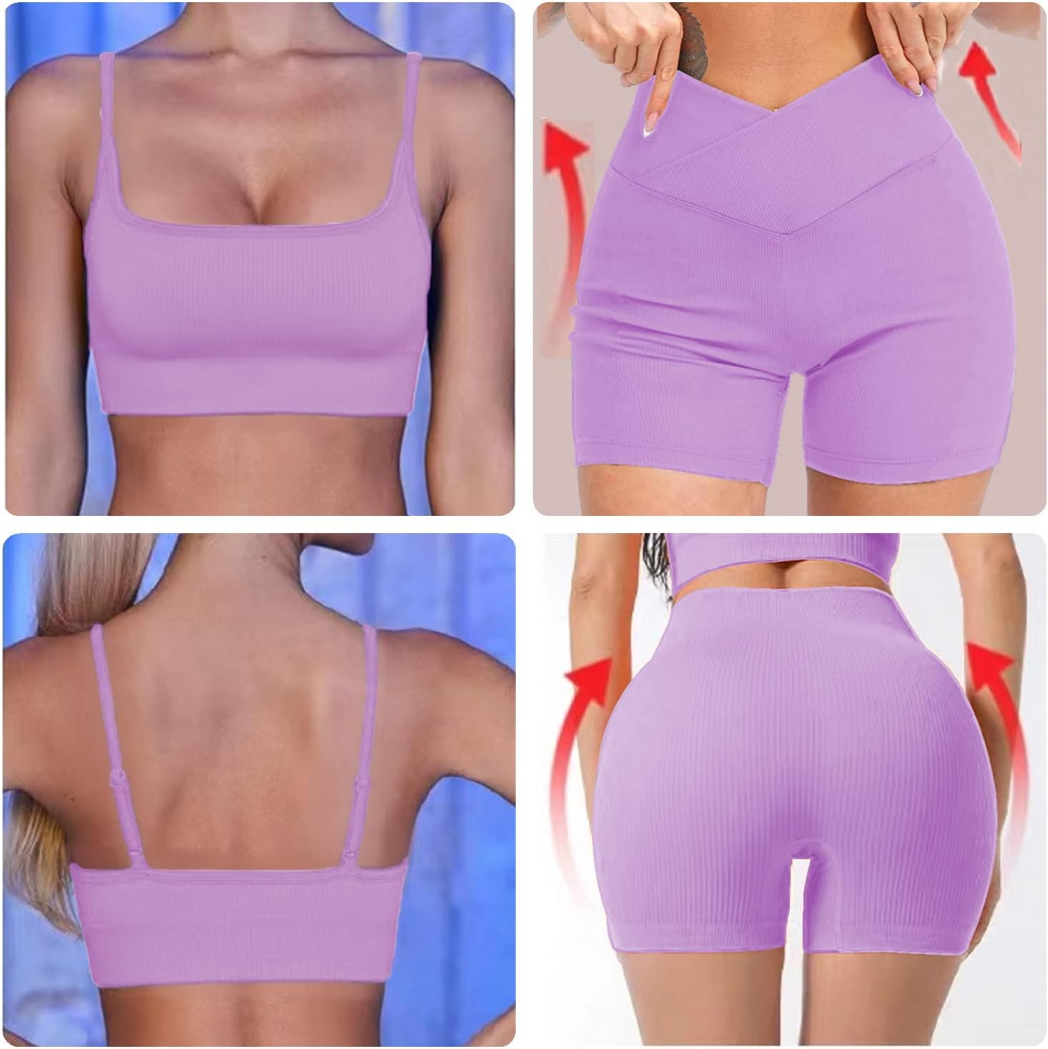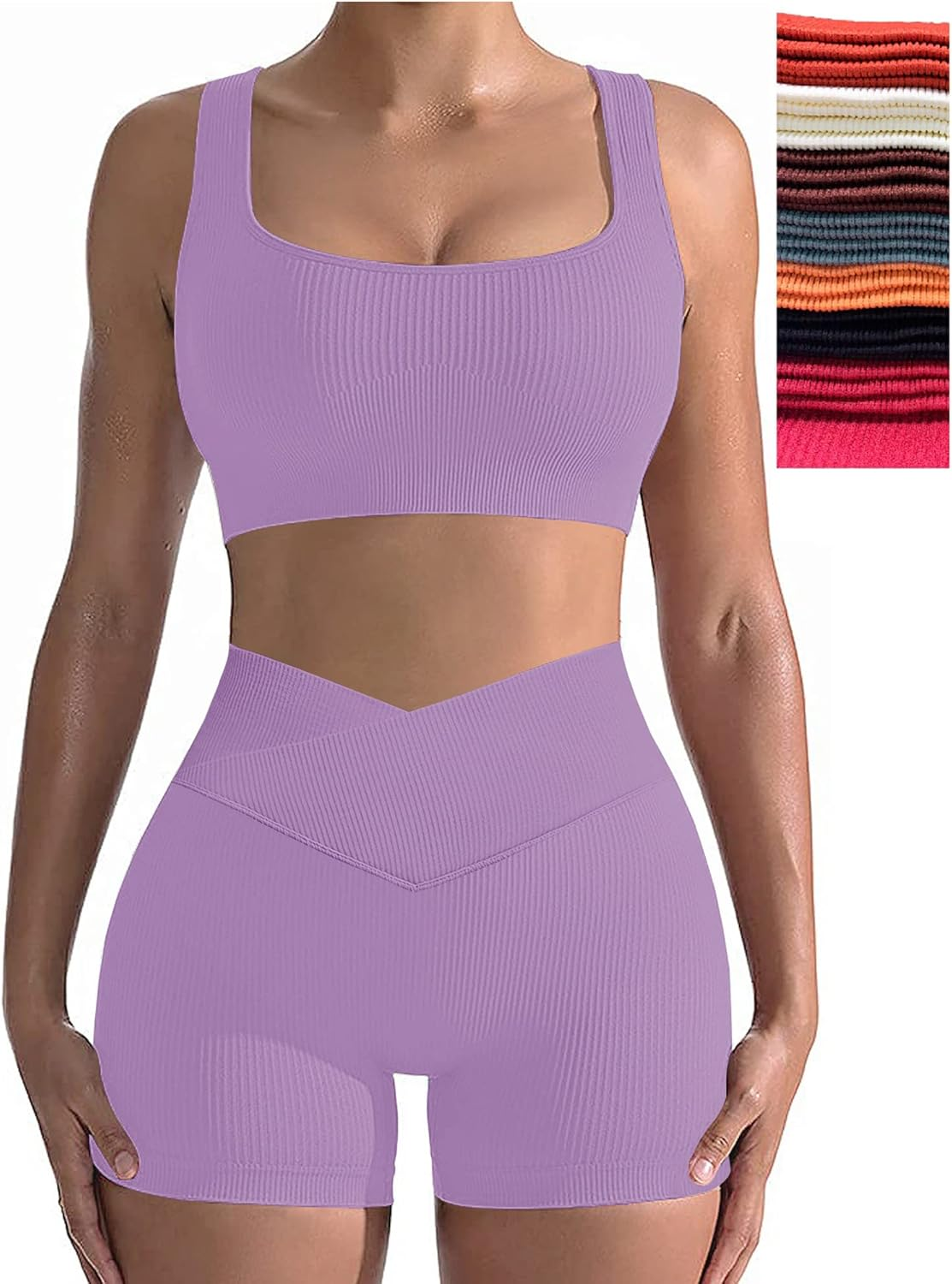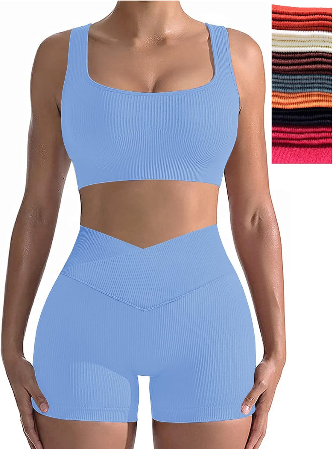Seamless Yoga Ribbed Workout Sets for Women Two Piece, Sexy Summer Sports Bra and Crossover Shorts Matching Workout Set, Cute 2 Piece Crop Top High Waist Leggings Workout Outfits for Gym