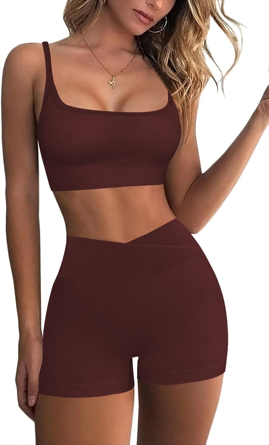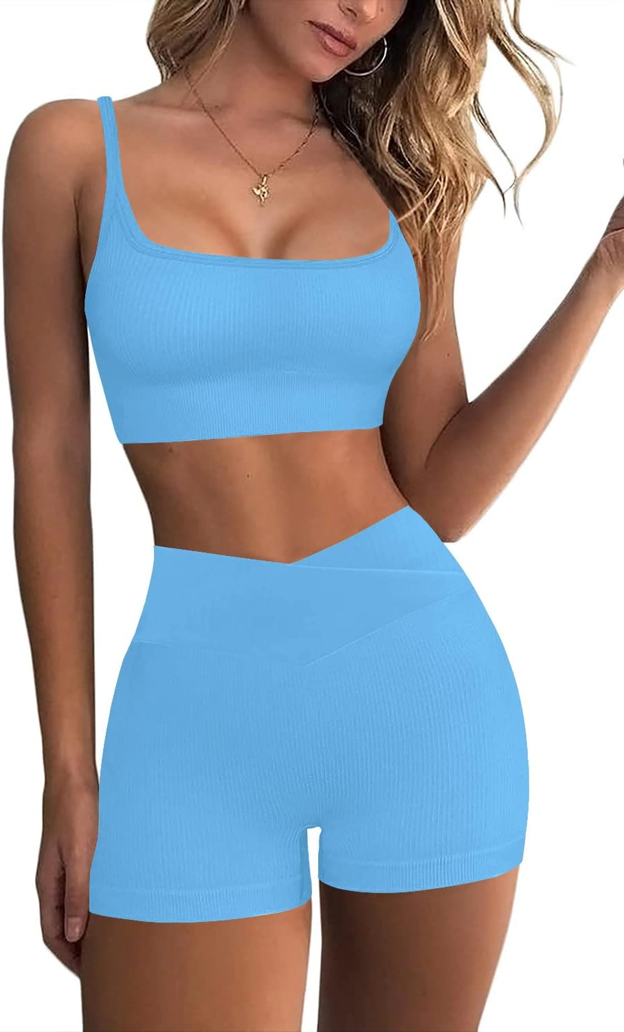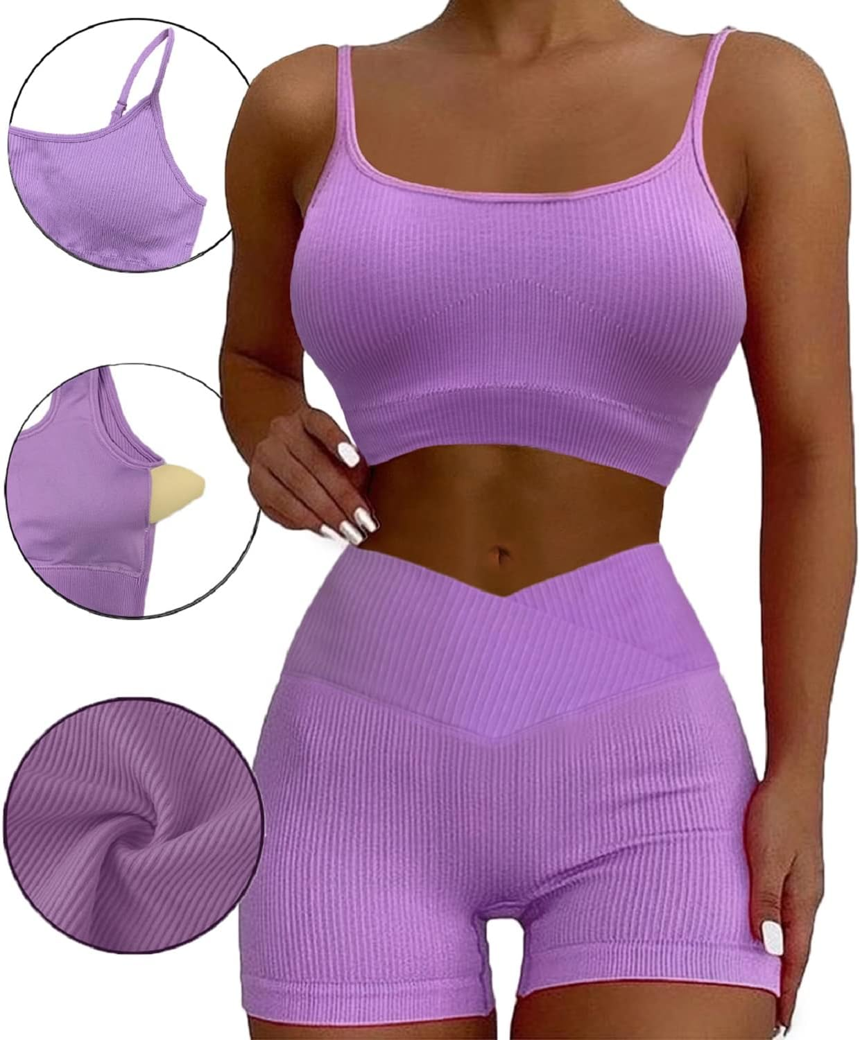 Seamless Yoga Ribbed Workout Sets for Women Two Piece, Sexy Summer Sports Bra and Crossover Shorts Matching Workout Set, Cute 2 Piece Crop Top High Waist Leggings Workout Outfits for Gym