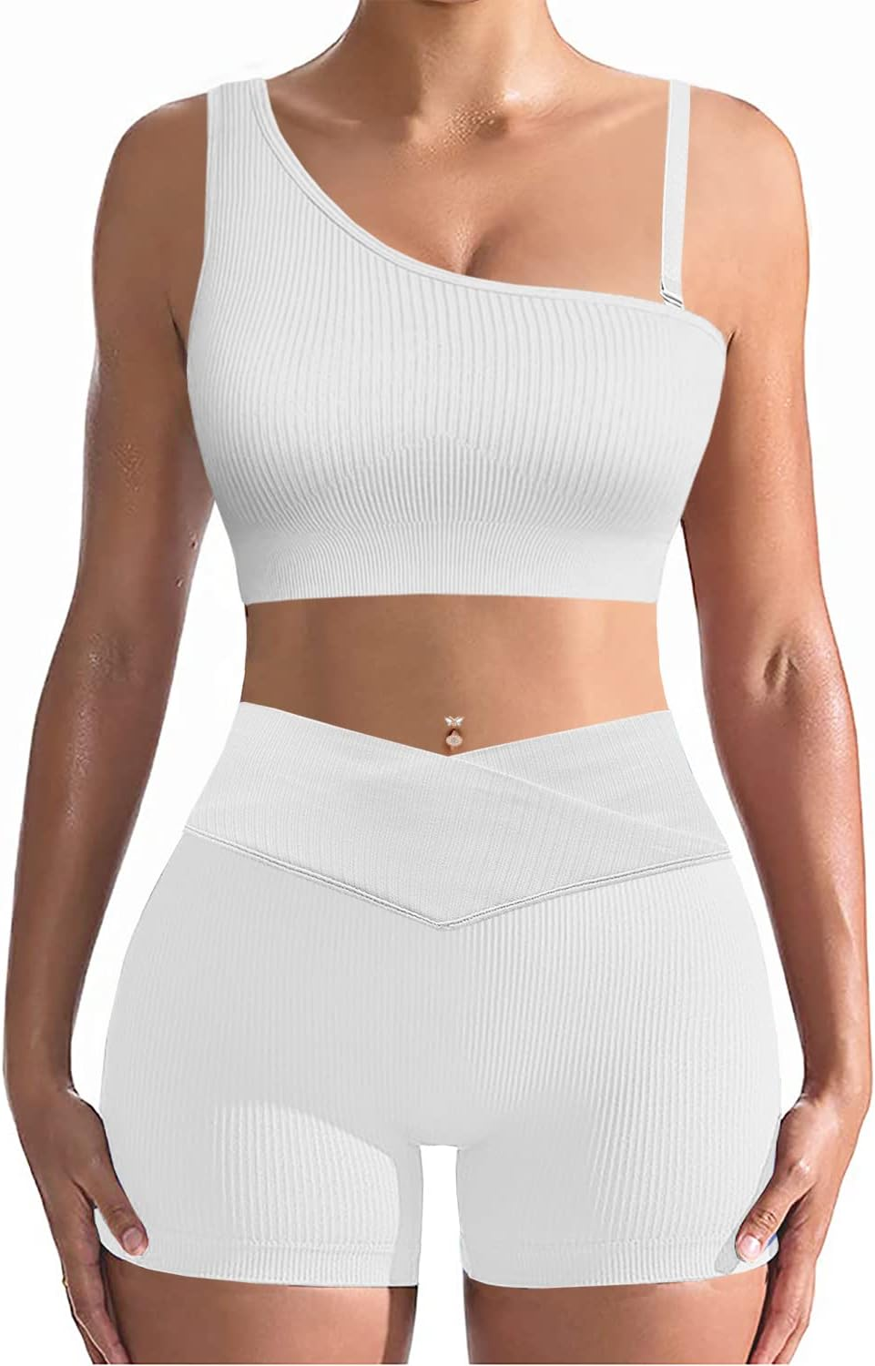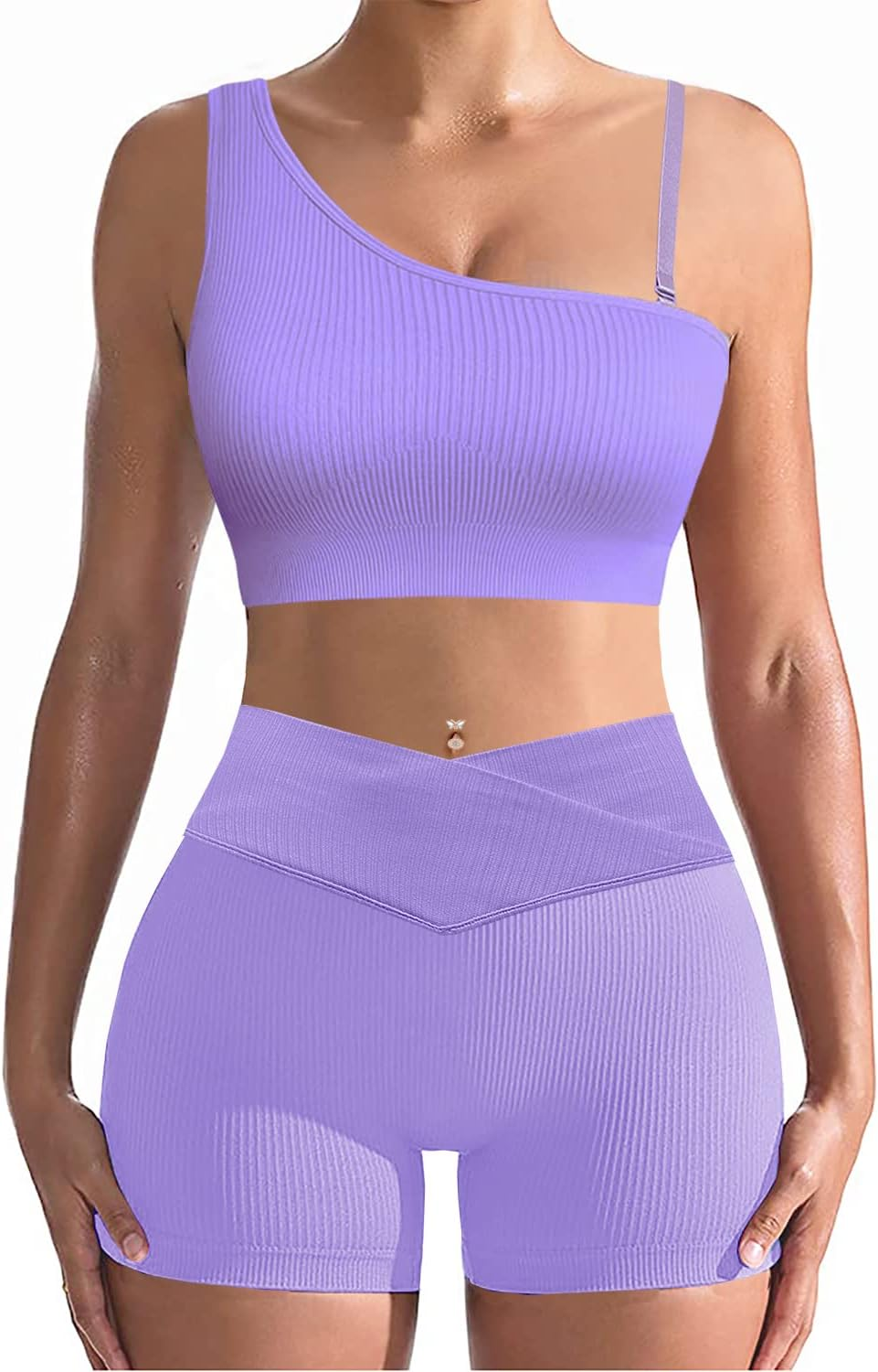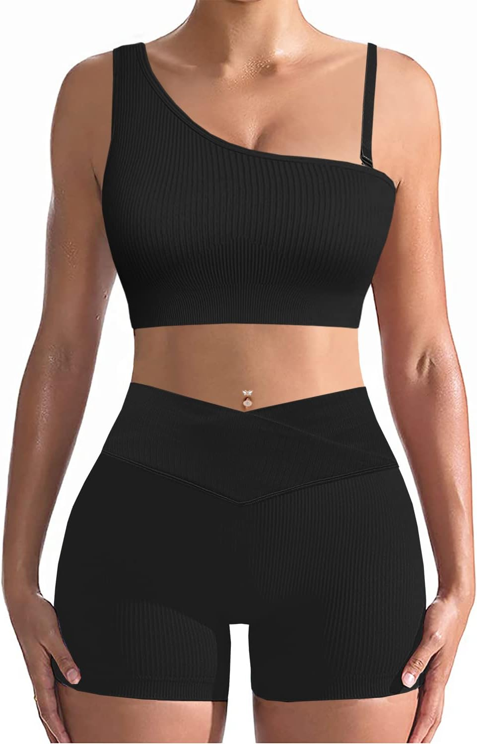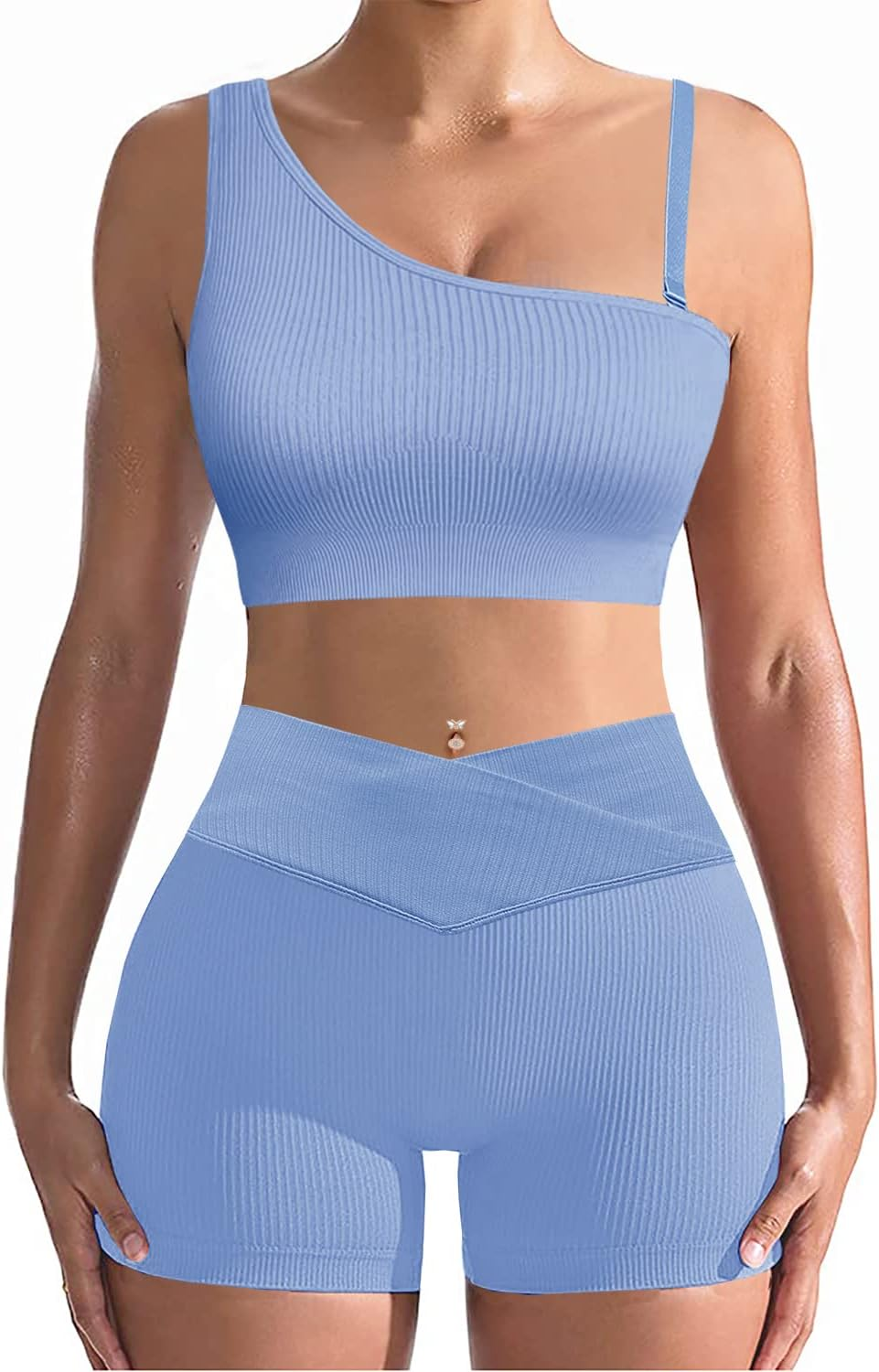 Seamless Yoga Ribbed Workout Sets for Women Two Piece, Sexy Summer Sports Bra and Crossover Shorts Matching Workout Set, Cute 2 Piece Crop Top High Waist Leggings Workout Outfits for Gym